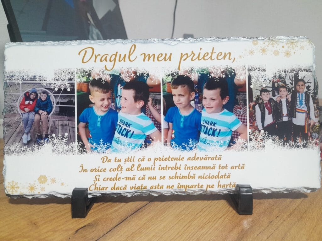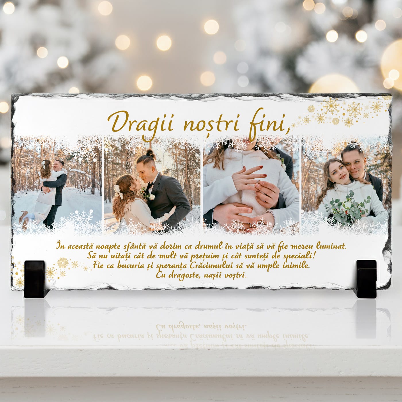 Realizată dintr-o bucată de piatră naturală, fiecare placă de ardezie are o textură unică și margini finisate manual, ceea ce face ca fiecare cadou să fie cu adevărat unic. Imprimarea de înaltă calitate redă fotografiile în culori vii, iar detaliile aurii ale fulgilor de nea adaugă o notă de strălucire festivă. Placa vine însoțită de un suport discret, fiind gata de a fi expusă pe comodă, în bibliotecă sau în orice alt loc de cinste din casa finilor.