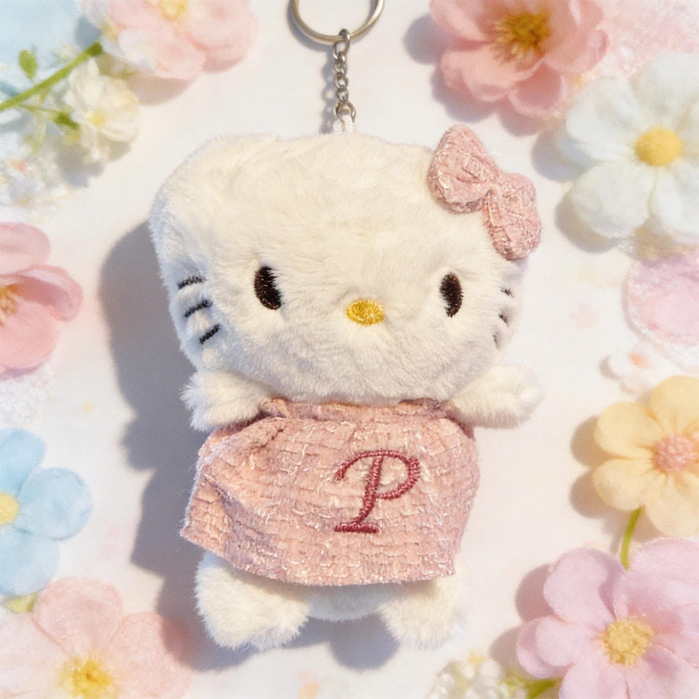 - Personalizare Elegantă: Pisicuța poartă o rochiță roz pudrat, realizată dintr-un material texturat (tip tweed/bouclé), pe care este brodată cu fir vișiniu inițiala numelui tău (sau a persoanei căreia îi dăruiești).