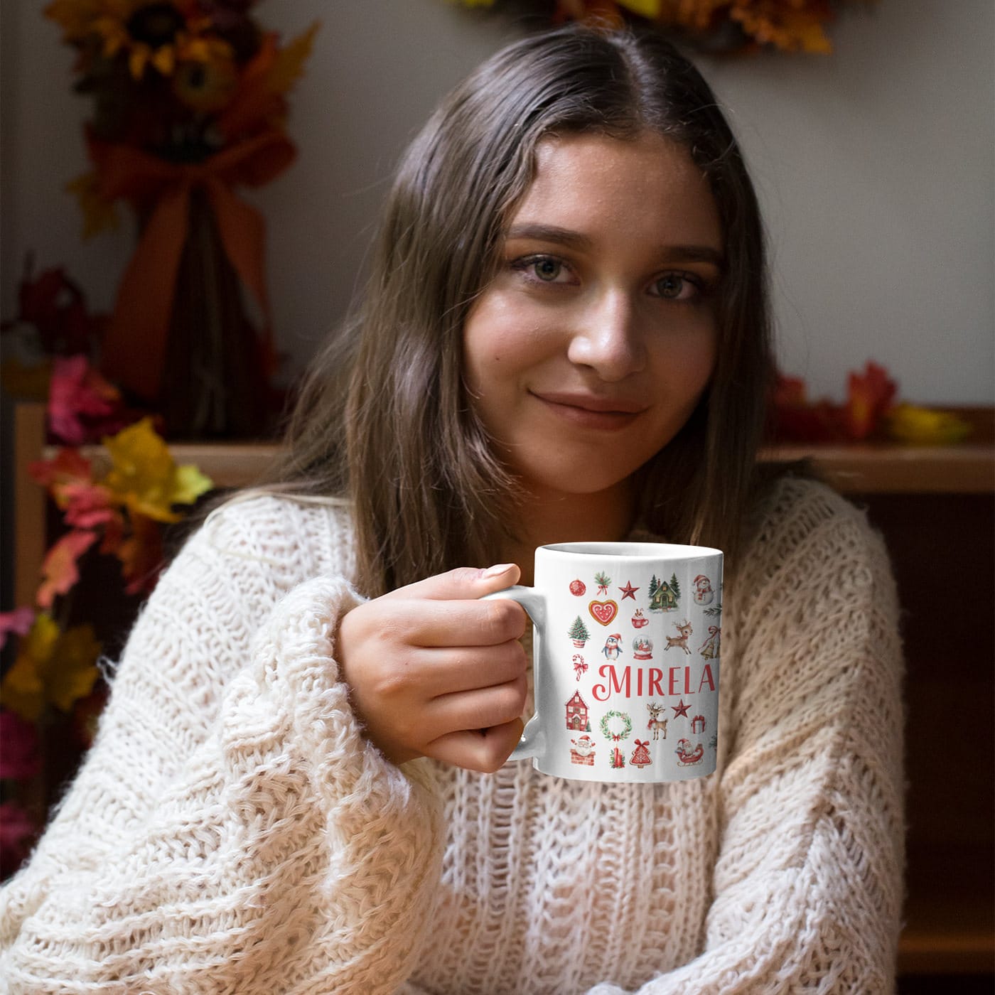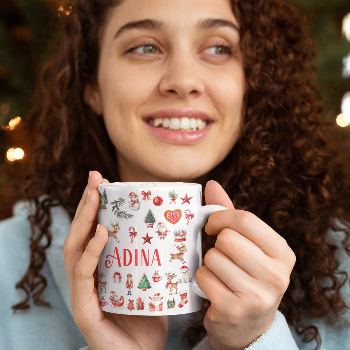 În inima acestui univers festiv, se află piesa de rezistență: numele tău (sau al persoanei dragi), scris cu o caligrafie roșie, elegantă și plină de căldură. Acest detaliu transformă cana dintr-un obiect frumos într-o comoară personală, un cadou care spune „Acest Crăciun este despre tine”.