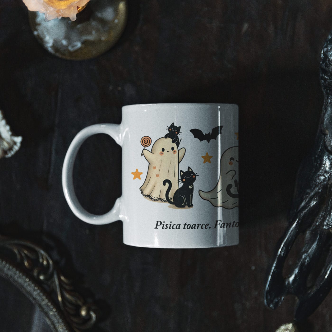 Toamna are o magie aparte. E sezonul puloverelor pufoase, al păturilor călduroase, al frunzelor arămii și, desigur, al băuturilor calde care ne încântă sufletul. Această cană a fost creată pentru a fi partenerul perfect al acestor momente. Nu este o cană înfricoșătoare, ci una plină de farmec și căldură, care celebrează partea jucăușă și confortabilă a sezonului de Halloween printr-o mică poezie de dimineață: „Pisica toarce. Fantoma plutește. Cafeaua mă ispitește…”