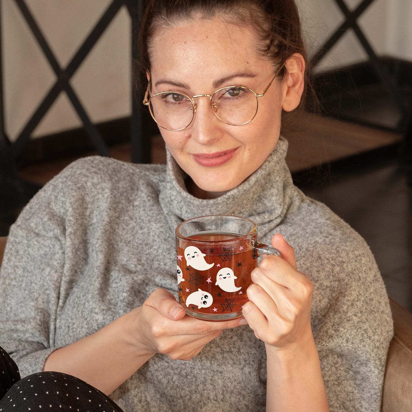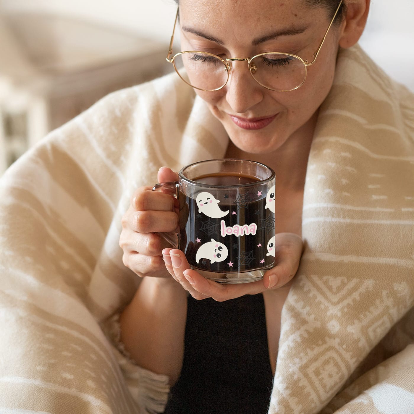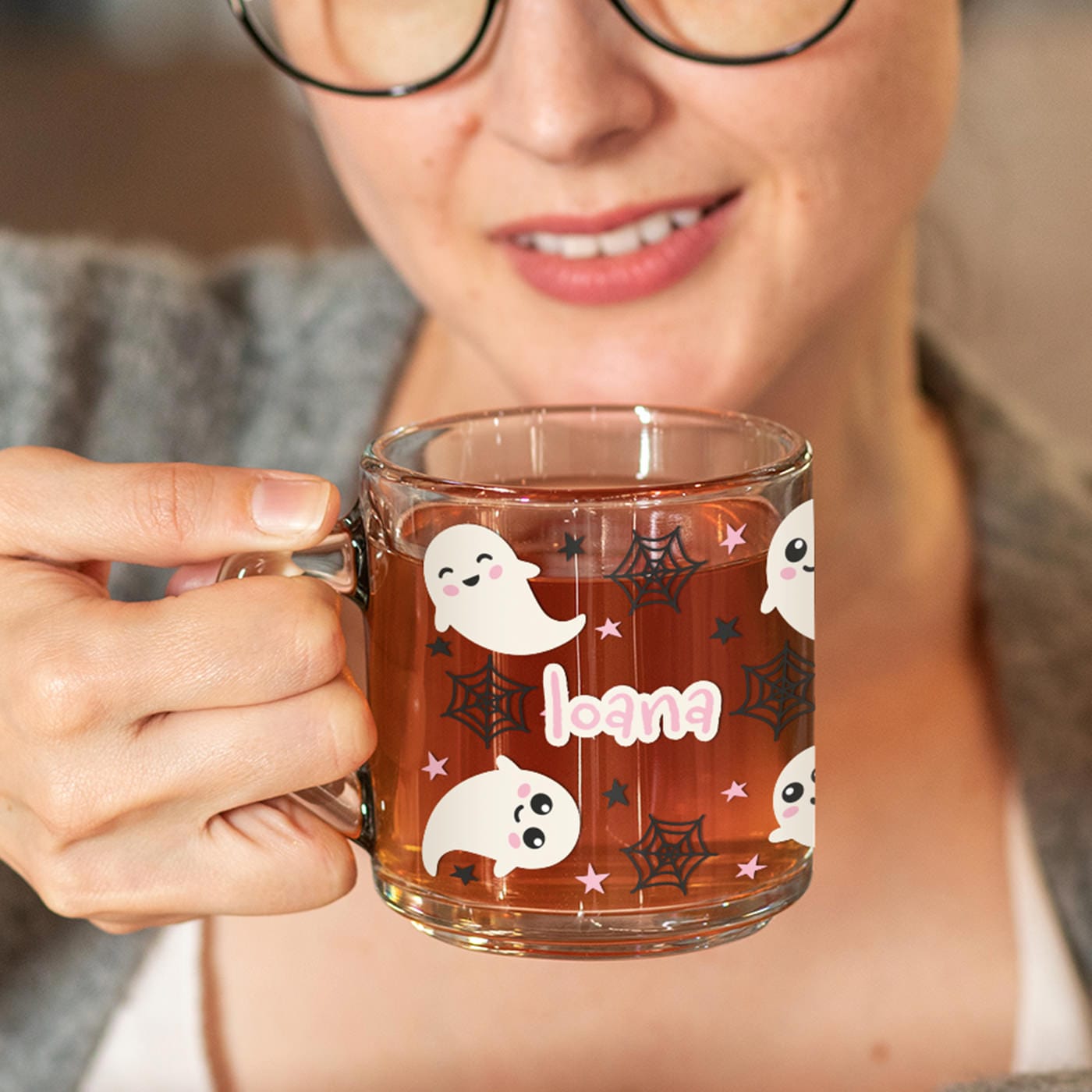 Realizată din sticlă transparentă de înaltă calitate, cana oferă un efect vizual deosebit. Culoarea băuturii tale – fie că este negrul cafelei, roșcatul ceaiului de fructe sau albul laptelui – devine parte din design, creând un contrast superb cu imprimeul alb al fantomițelor.