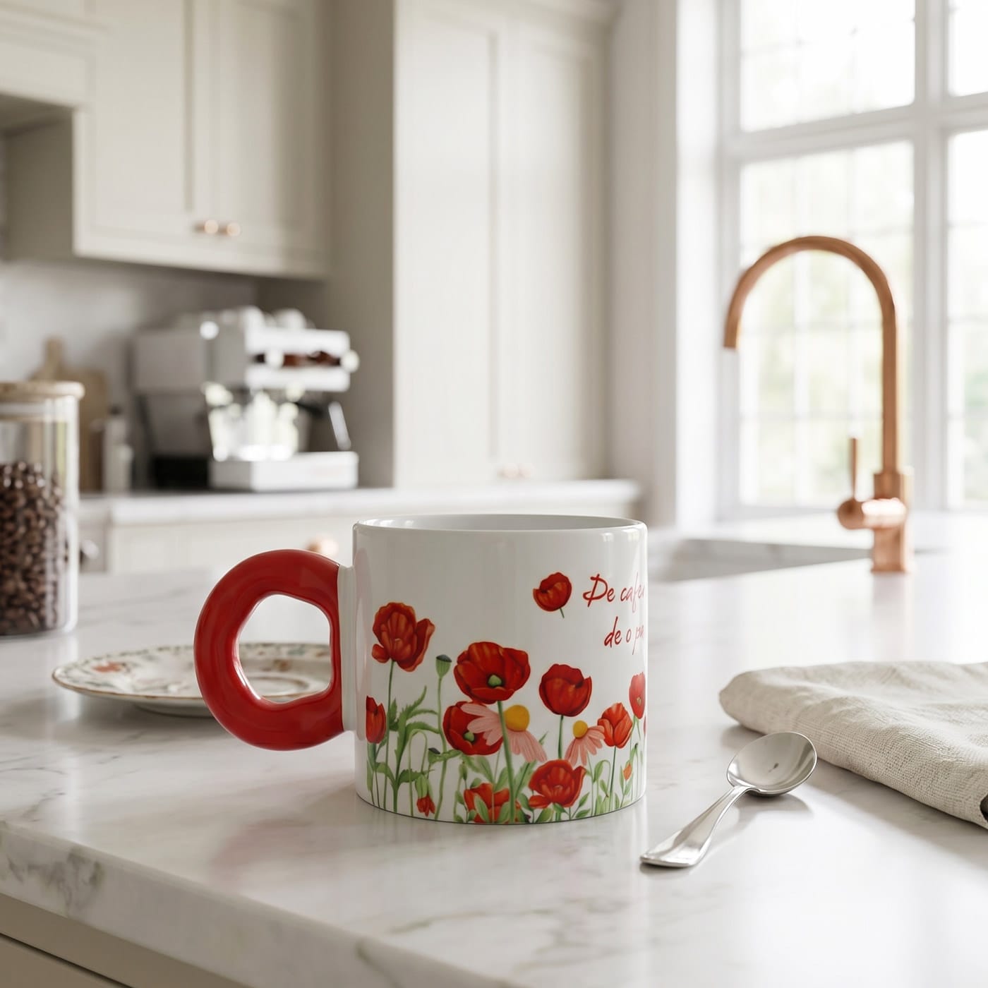 - Grafică cu Maci: Ilustrația vibrantă cu maci roșii simbolizează prospețimea și frumusețea, oferind cănii un aspect artistic și atemporal care atrage privirea pe orice masă.