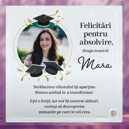 - Notă Personală: Numele tău însoțit de toca de absolvent, semnătura oficială a succesului tău academic.