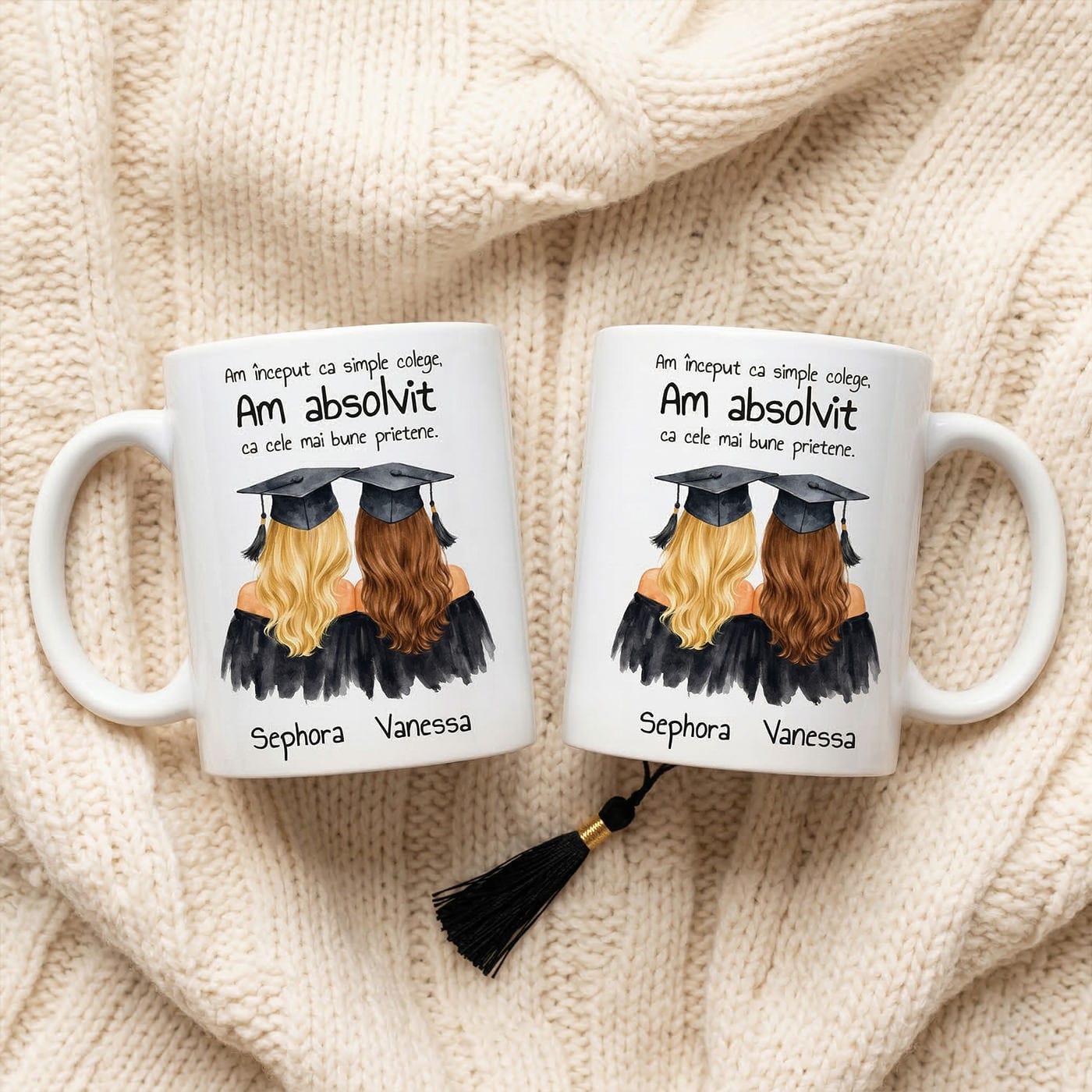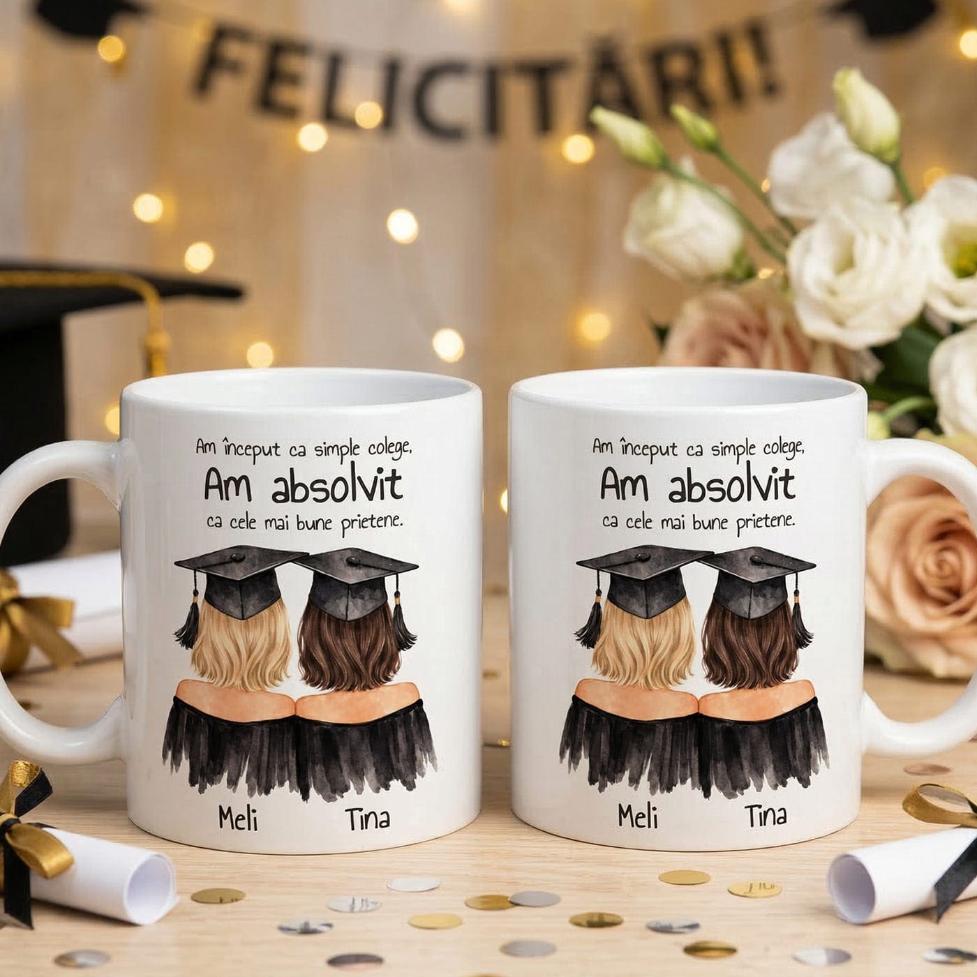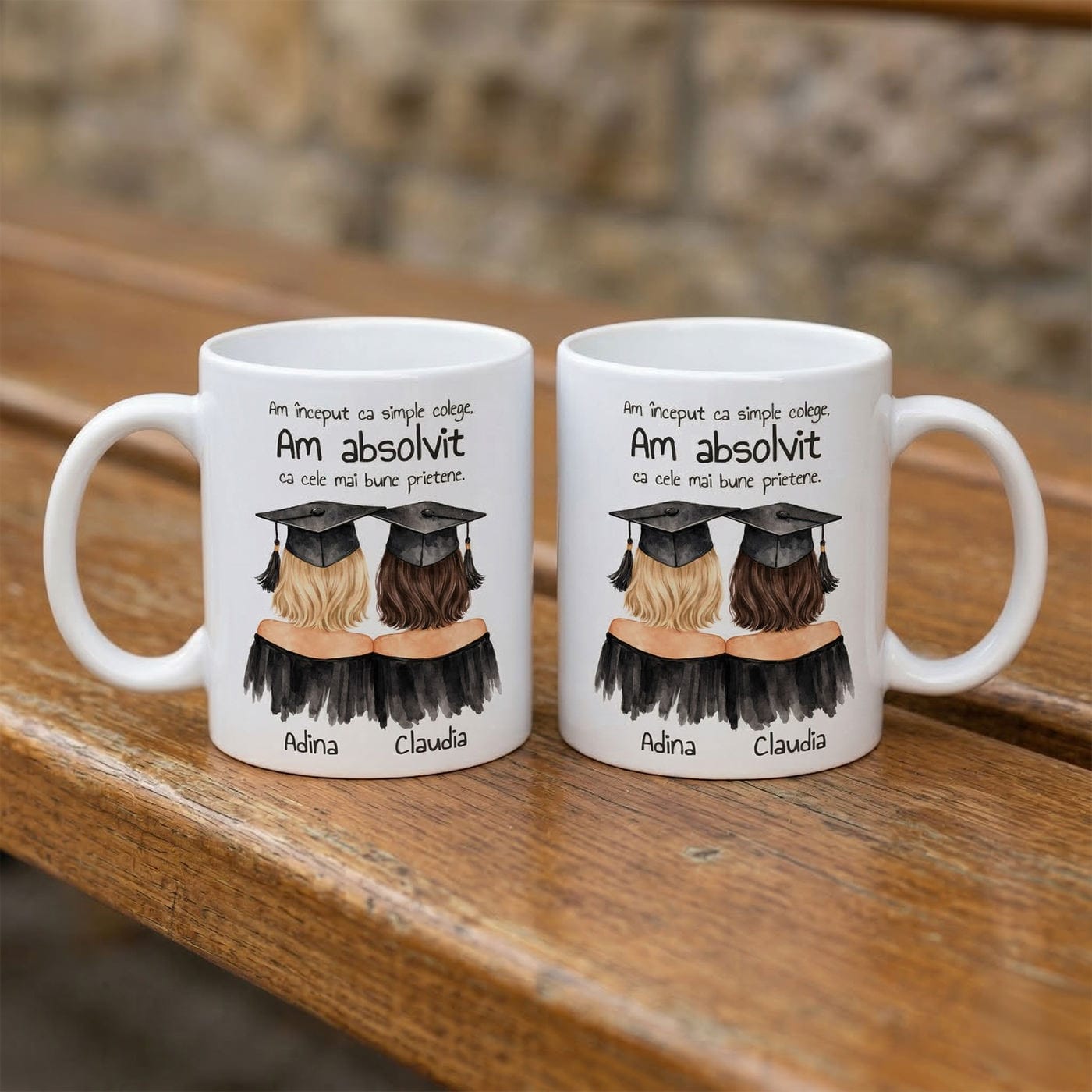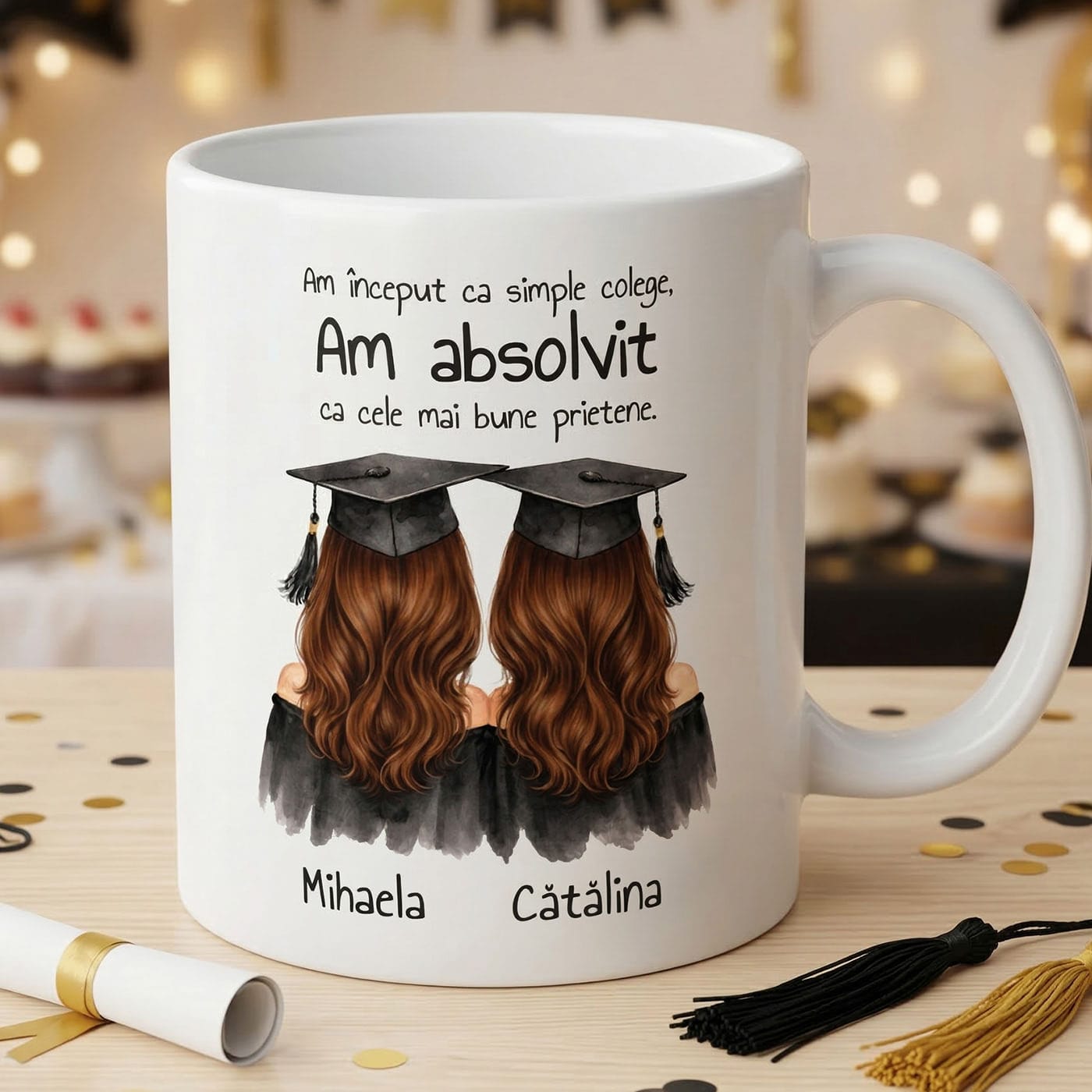 Anii de școală ne oferă lecții valoroase, dar cel mai mare premiu cu care plecăm la final sunt oamenii pe care îi cunoaștem. Sărbătorește finalul unui capitol important și începutul unei prietenii pe viață cu această cană personalizată de absolvire. Este cadoul perfect pentru colega de bancă, colega de cameră din cămin sau „partenera ta de crime” din timpul sesiunilor grele.
