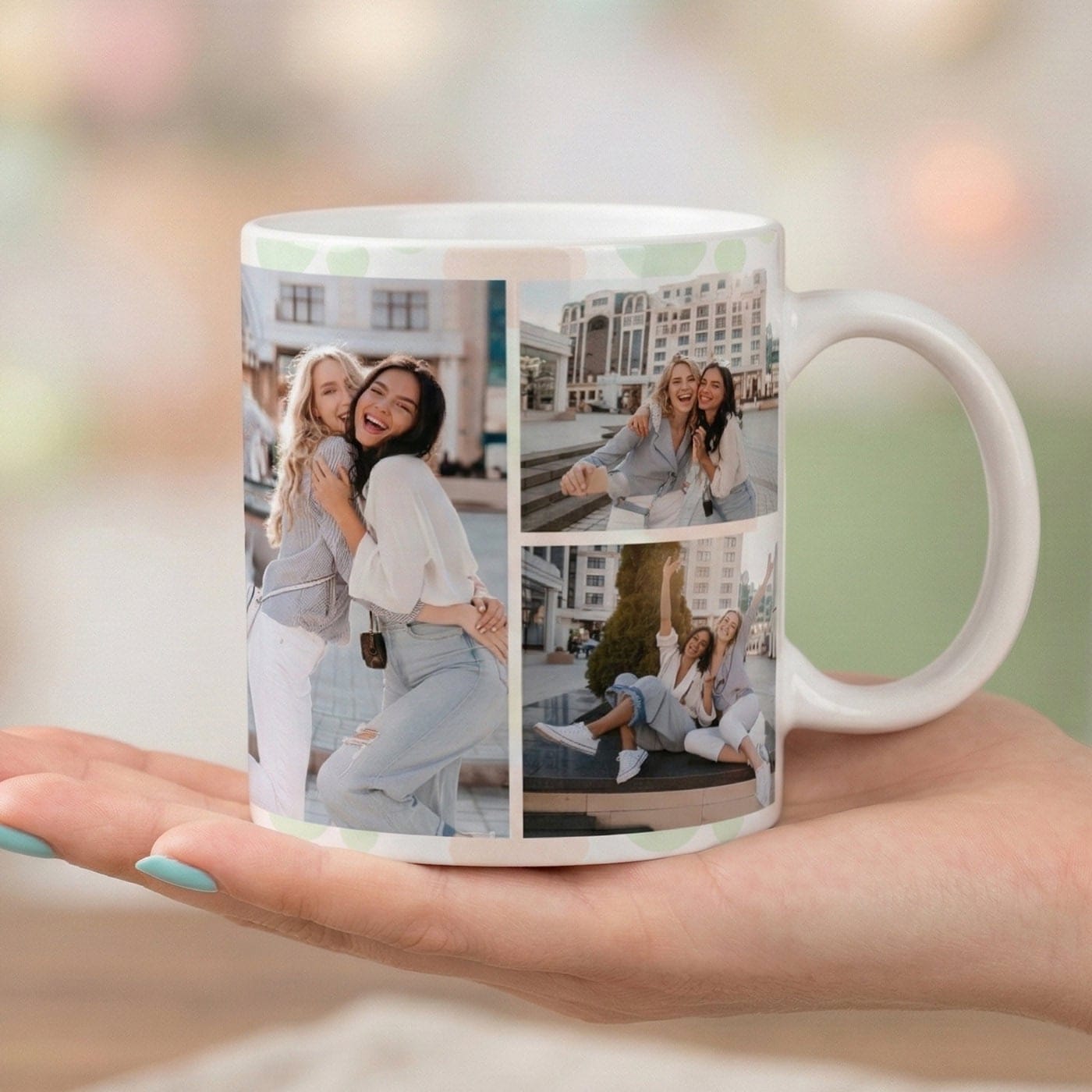 Fotografiile sunt aranjate tip grilă, alternând formate verticale și orizontale pentru un efect dinamic. Deasupra și dedesubtul colajului, o bordură cu buline pastel — în nuanțe de roz, verde și piersică — completează designul cu o notă jucăușă și feminină. Este genul de cană care îți scoate un zâmbet chiar și la prima cafea de luni dimineață.