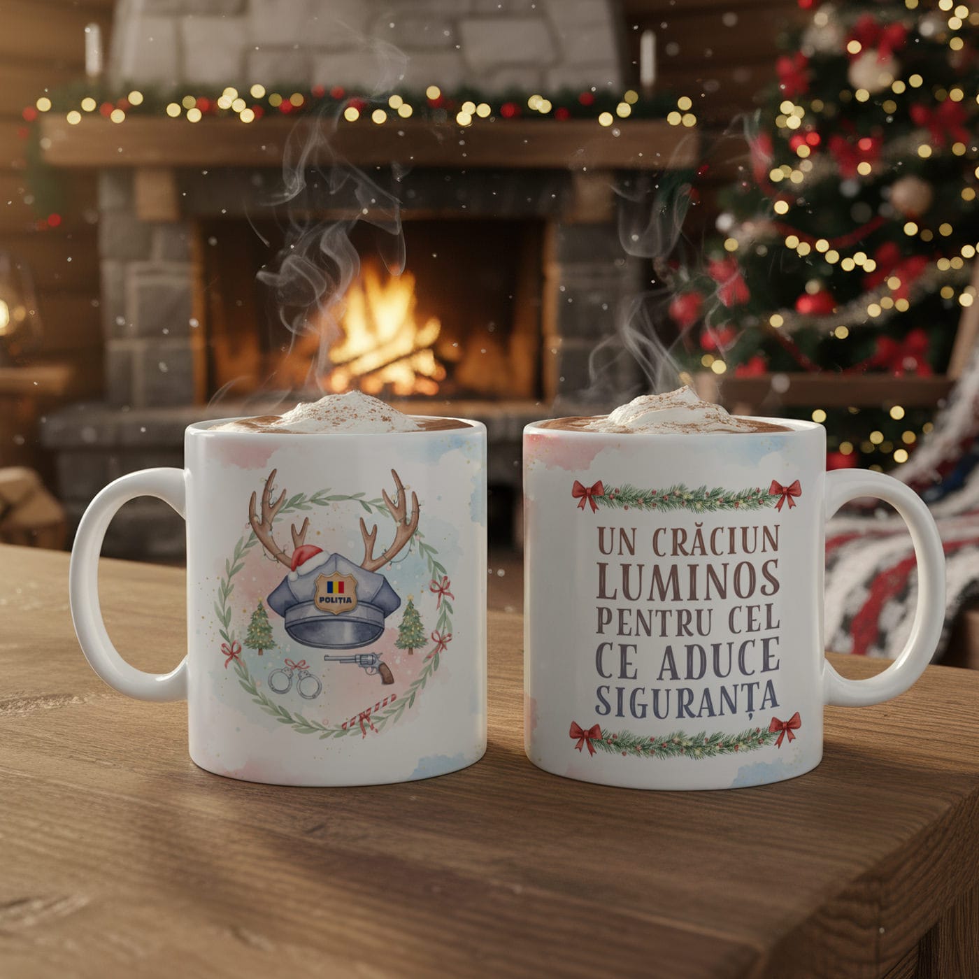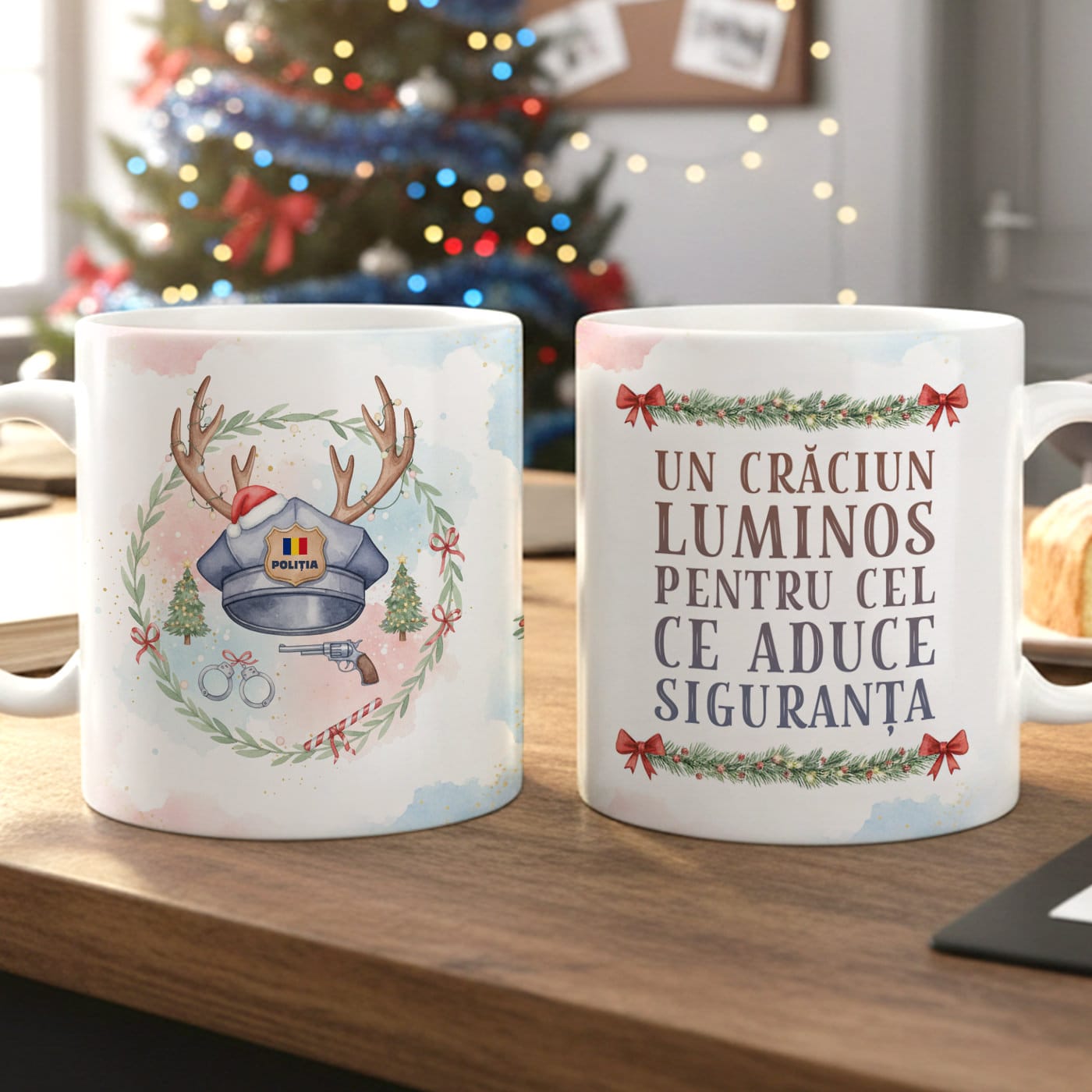- Partea cu Ilustrație: O imagine plină de farmec și umor, care îmbină simbolurile profesiei (șapca de polițist, cătușe, pistol) cu magia Crăciunului: șapca este decorată festiv cu coarne de ren, totul fiind încadrat într-o coroniță de sărbătoare.