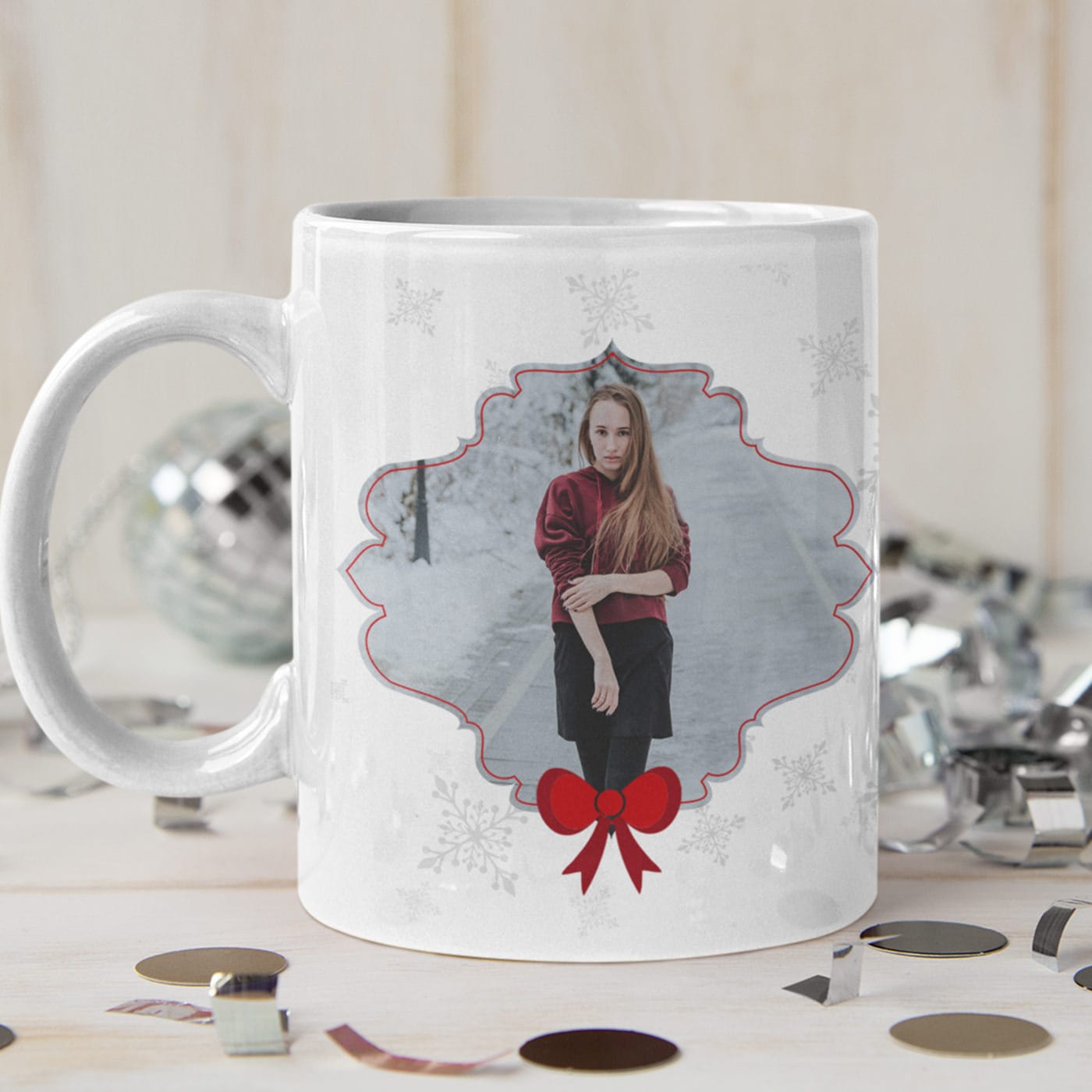 Cu un fundal alb, imaculat, presărat cu fulgi de nea subtili, designul acestei căni evocă perfect atmosfera sărbătorilor de iarnă. Culoarea roșie, vibrantă, a textului și a fundiței adaugă o notă de căldură și pasiune, creând un contrast vizual plin de rafinament.