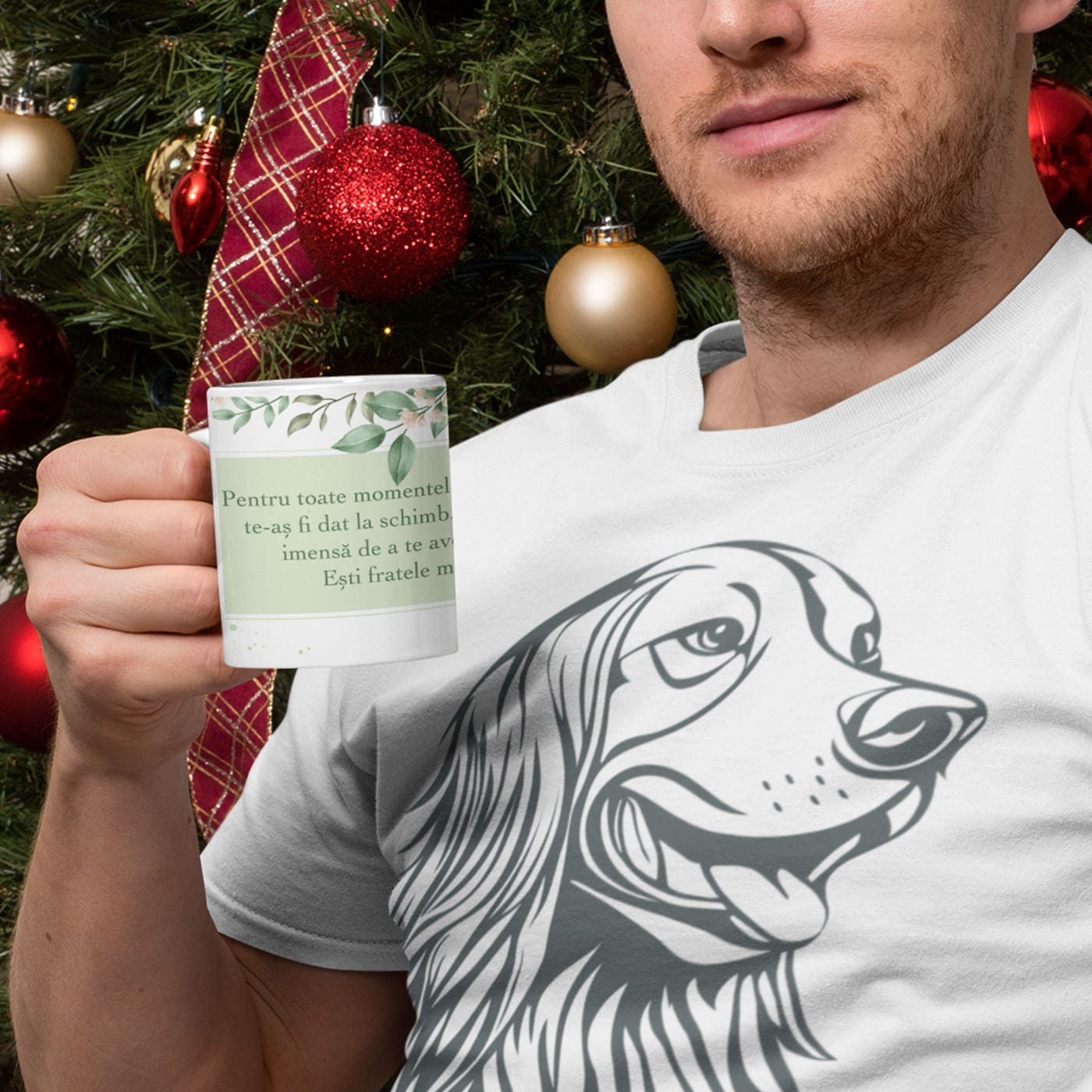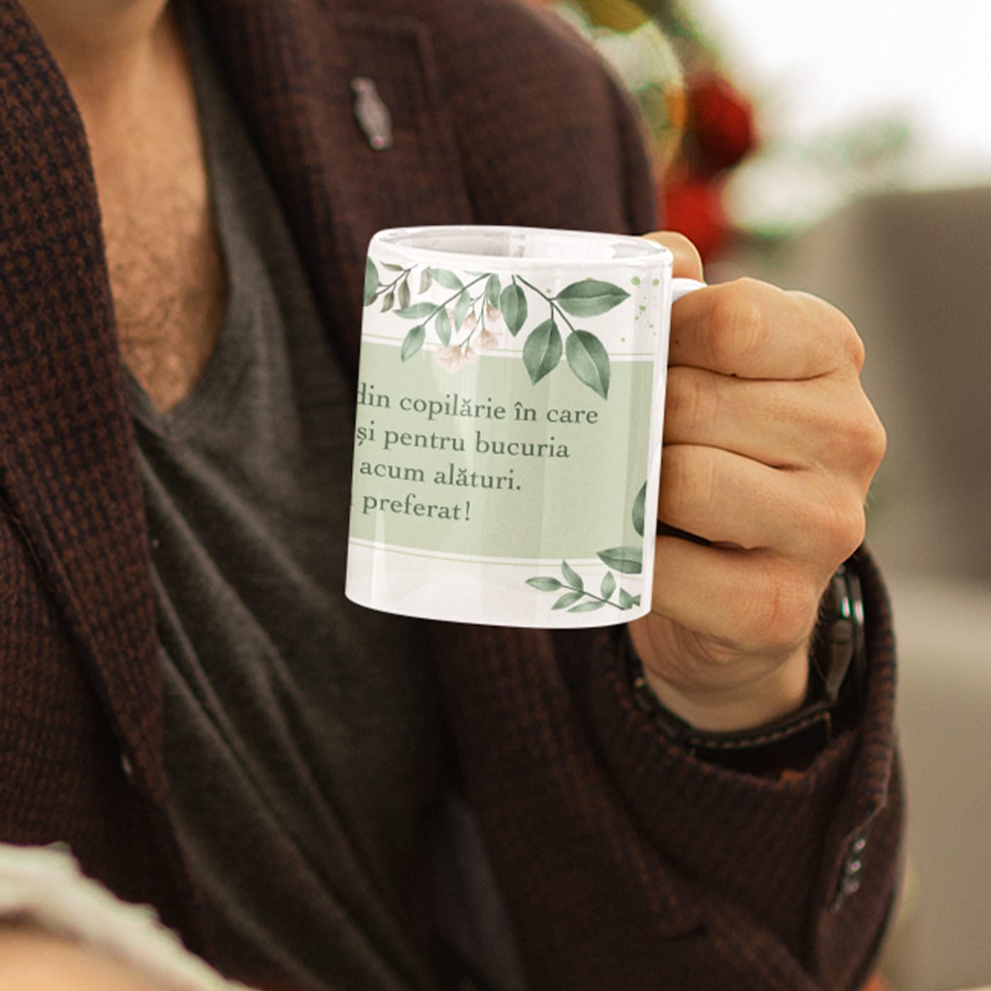 Am ales un design minimalist și plin de bun gust, cu motive botanice delicate, pentru a crea un produs pe care fratele tău îl va folosi cu plăcere. Nu este o cană generică, ci un obiect elegant. Fabricată din ceramică de înaltă calitate, este robustă și perfectă pentru cafeaua de dimineață sau ceaiul de seară. Imprimarea este durabilă, rezistentă la mașina de spălat vase și la cuptorul cu microunde.