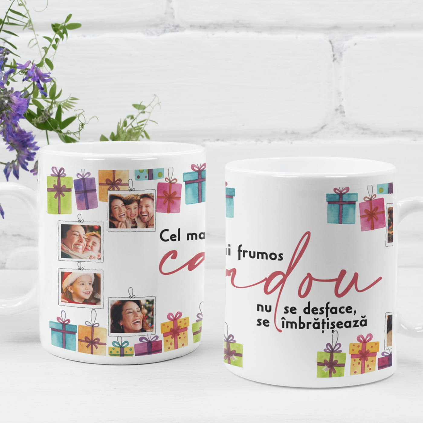 O îmbrățișare este plină de amintiri. De aceea, pe lângă mesajul plin de suflet, am creat un spațiu pentru o adevărată galerie a bucuriei voastre: un colaj de 8 fotografii! Opt ferestre mici către momentele voastre de neuitat – zâmbete de copii, o vacanță specială, o poză de la Crăciunul trecut, o privire complice. Tu alegi momentele, iar noi le transformăm într-o poveste vizuală care înconjoară cana.