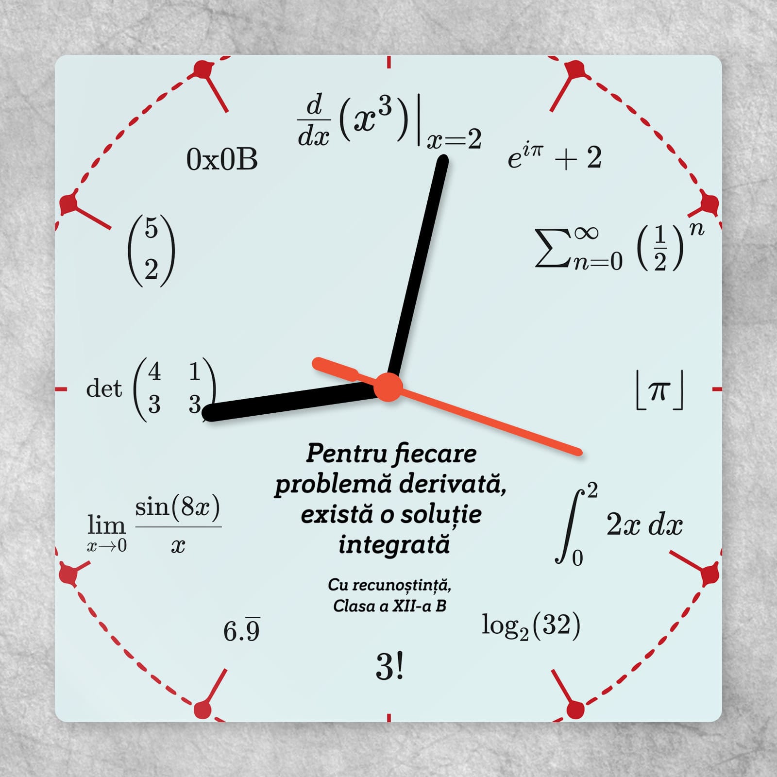 Profesorii de matematică sunt persoane care apreciază precizia, logica și provocările intelectuale. Dacă sunteți în căutarea unui cadou de sfârșit de an școlar, de absolvire a clasei a XII-a sau de 8 Martie care să îi lase cu adevărat fără cuvinte, acest ceas de perete este soluția… perfect integrată!