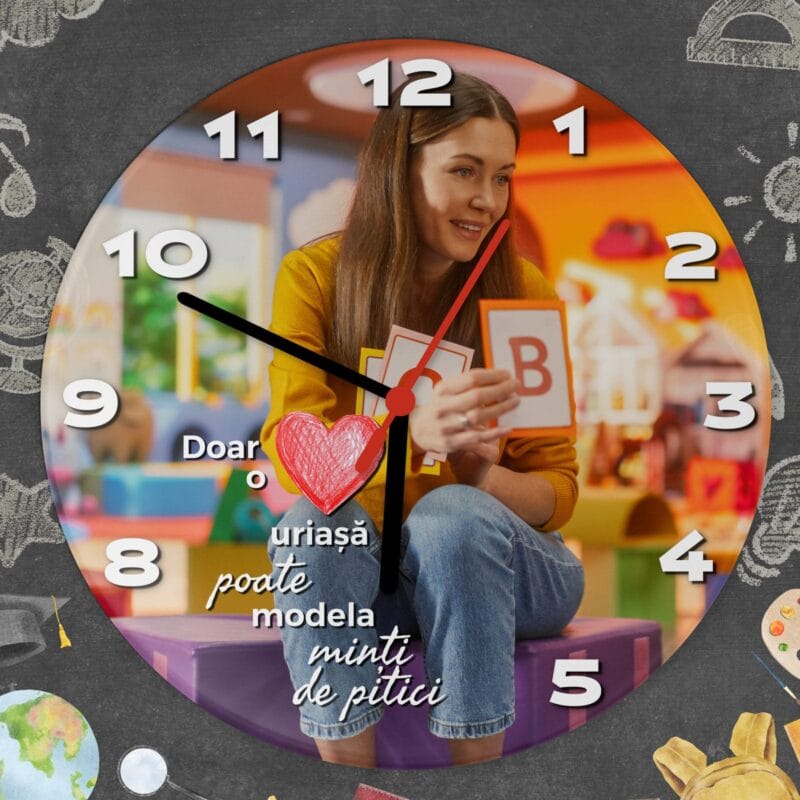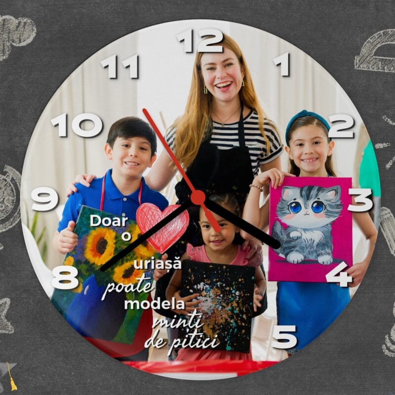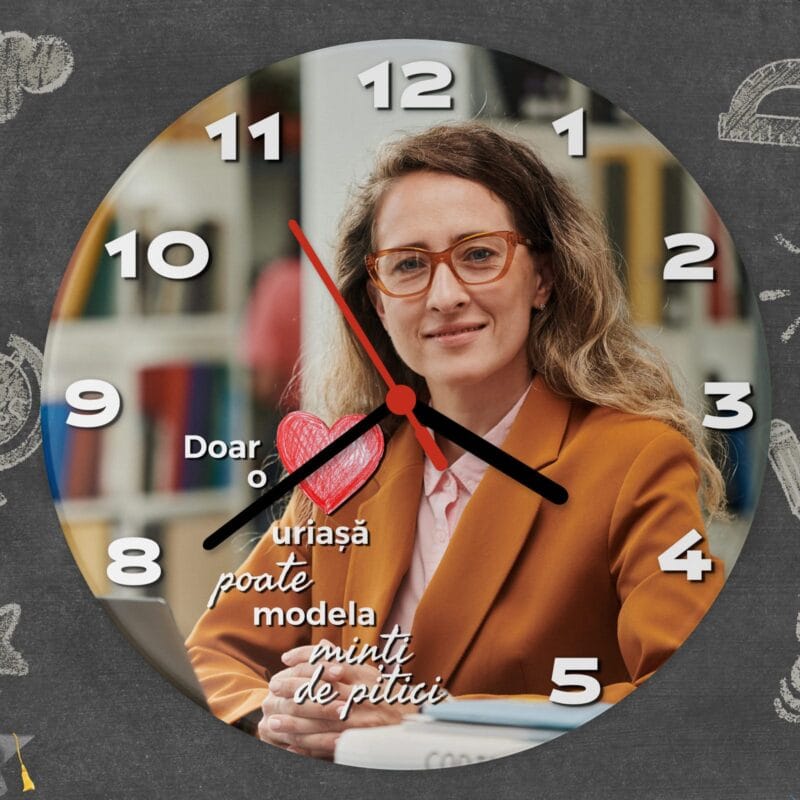 Ceasul personalizat Cadru Didactic este un cadou unic și special, conceput pentru a arăta aprecierea față de profesorii dedicați care modelează minți de pitici și care au un impact pozitiv asupra vieții și educației copiilor noștri. Acest ceas elegant poate fi personalizat cu o fotografie a cadrelor didactice și cu un cuvânt inspirațional care să reflecte strădania lor de a deschide lumea în mințile copiilor. De asemenea, poți alege dacă dorești ceasul cu fotografiile întregii clase.