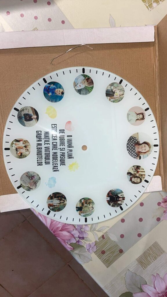 Designul este o capodoperă a personalizării. În locul cifrelor obișnuite, fiecare oră este marcată de chipul zâmbitor al unui elev. La ora 12, la loc de cinste, stă „Inima Clasei” – doamna învățătoare, ghidul și mentorul lor. Este un cerc complet al afecțiunii, o clasă unită care privește împreună spre viitor.