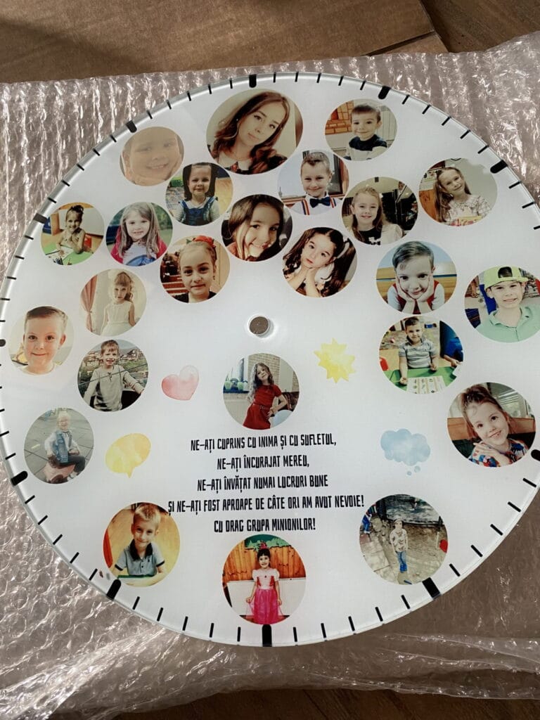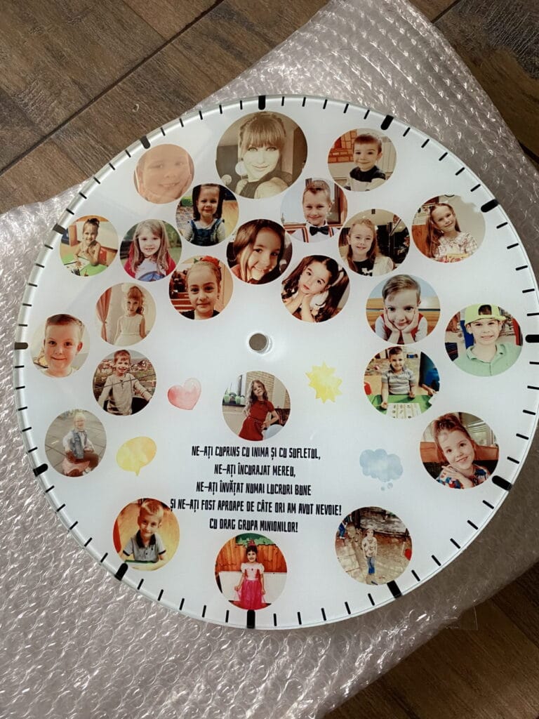Opriți timpul în loc și păstrați o amintire de neuitat! Acest ceas-omagiu este cadoul colectiv perfect pentru doamna învățătoare. Personalizat cu pozele tuturor elevilor și cu portretul dascălului la loc de cinste, este o „hartă” a recunoștinței. Mesajul „O inimă plină de iubire…” va emoționa garantat.