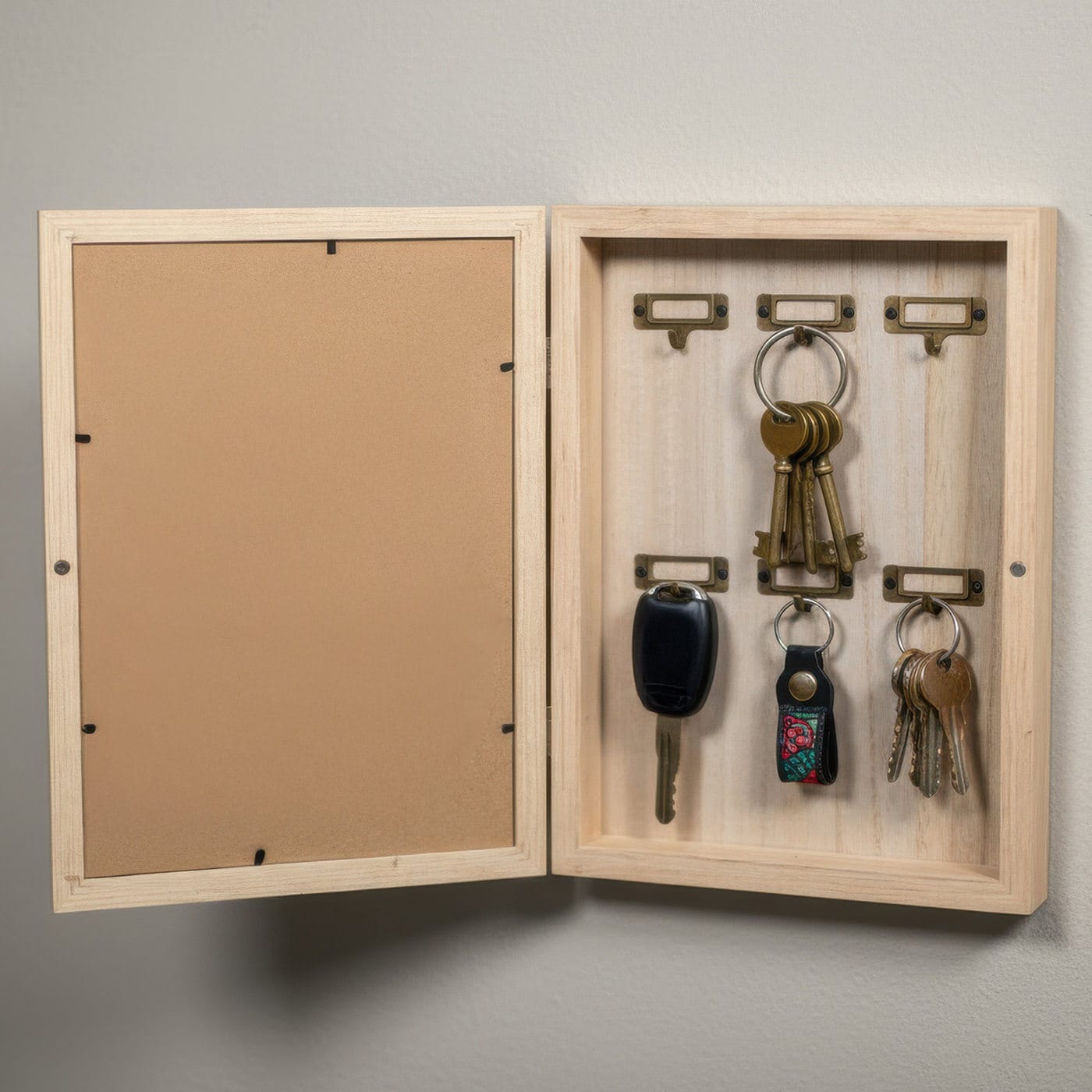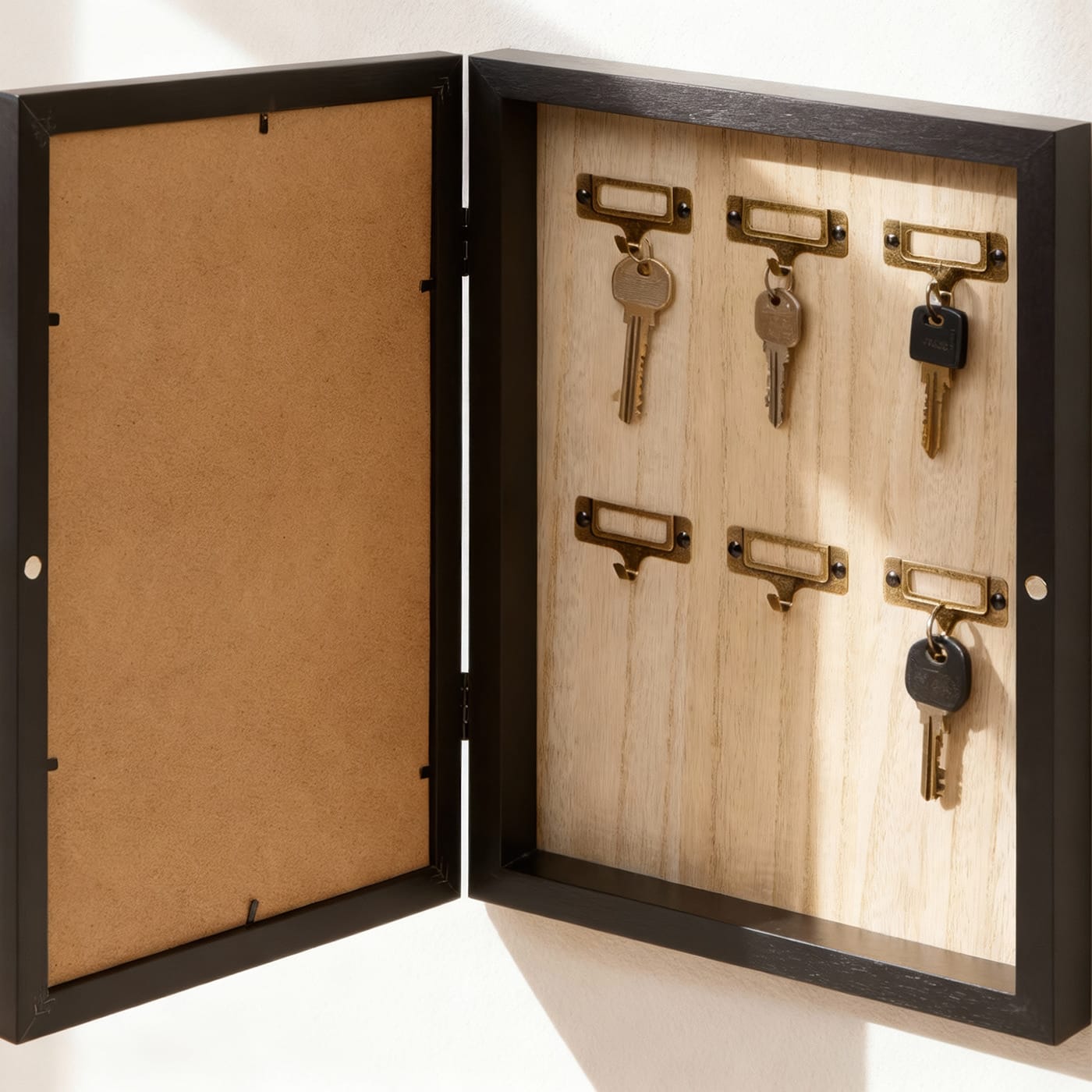 La prima vedere, este o ramă foto superbă, din lemn, care încadrează cu eleganță fotografia ta de familie, o amintire dintr-o vacanță sau un portret drag. Nimeni nu ar bănui secretul pe care îl ascunde. Cu o simplă deschidere, rama se transformă într-un suport pentru chei perfect organizat. Spune adio minutelor pierdute căutând cheile! Acum, ele vor avea un loc al lor, ascunse elegant la vedere.