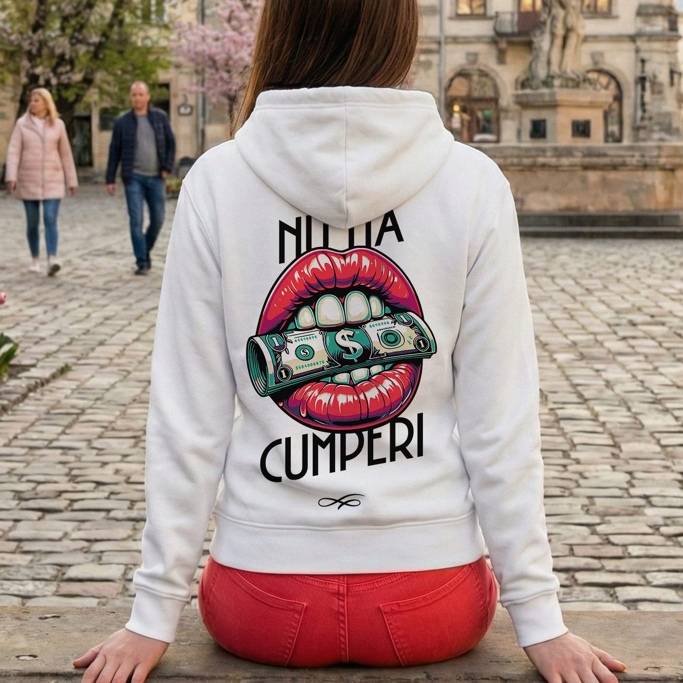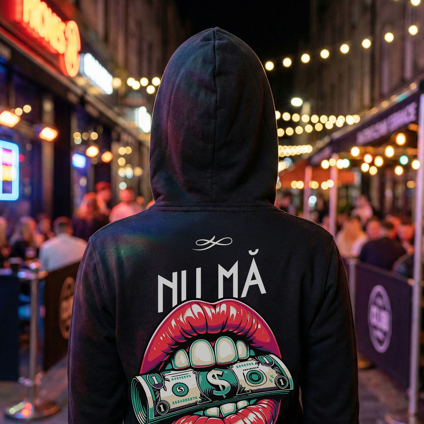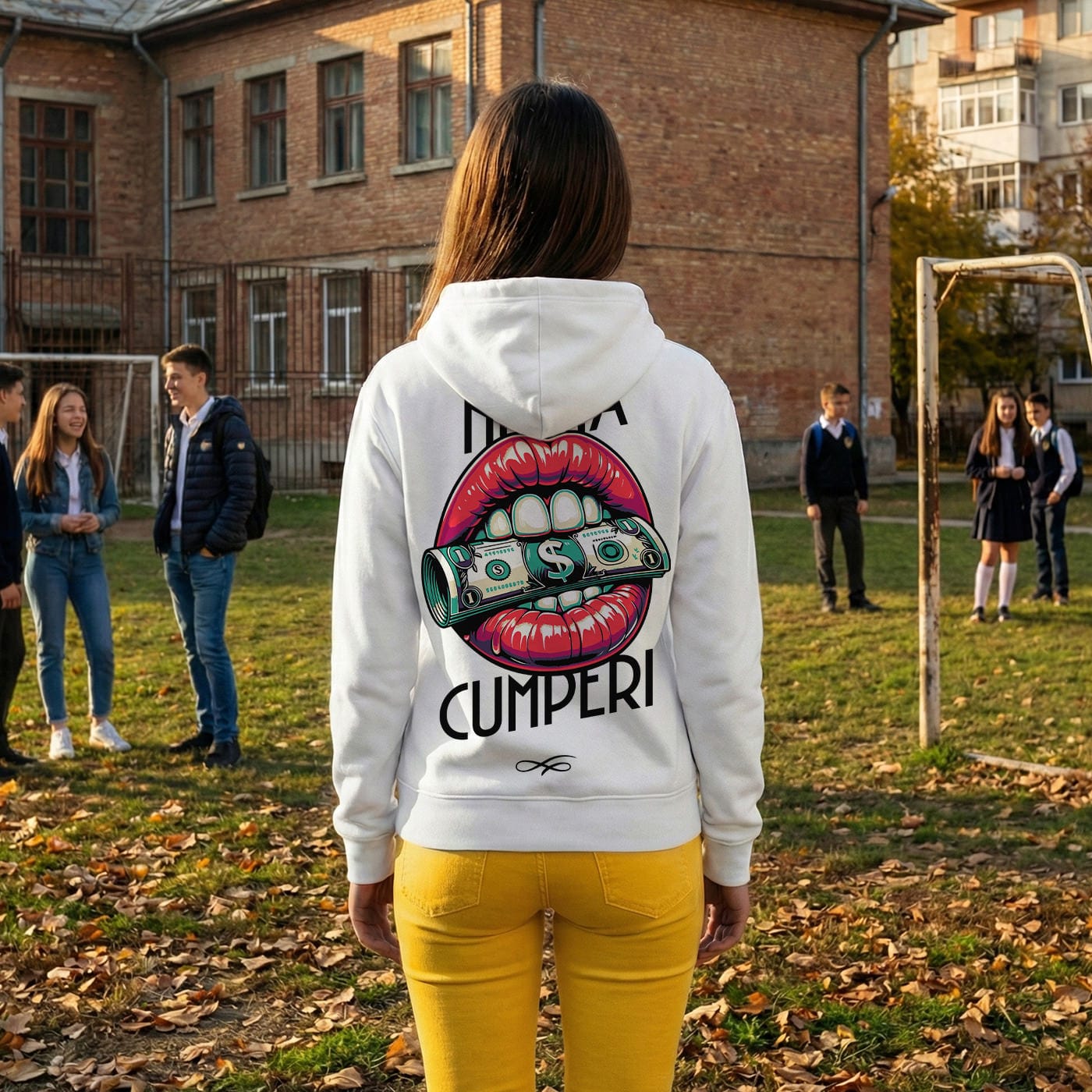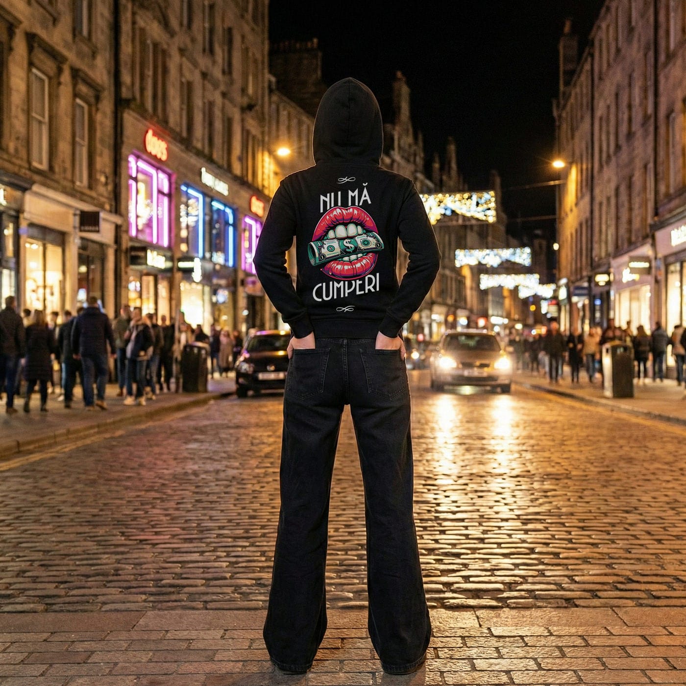 - Teaser-ul (Gluga Jos): Când porți hanoracul relaxat, gluga cade natural pe spate și poate acoperi prima parte a textului („NU MĂ”). Ce rămâne vizibil? Grafica provocatoare cu buzele care mușcă dolarii și cuvântul „CUMPERI”. O invitație ironică sau o provocare?