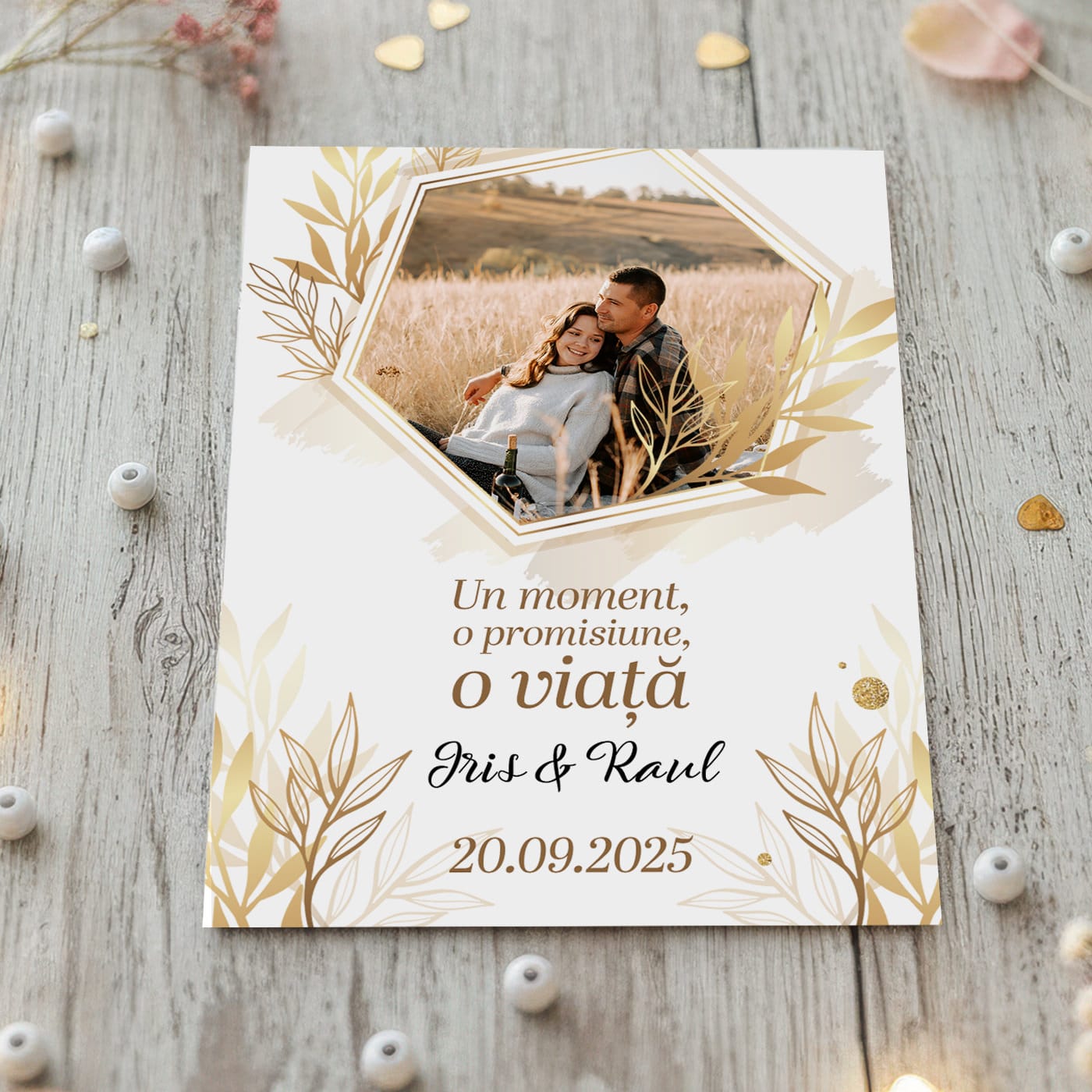 Am creat un design care îmbină modernul cu romantismul. Fotografia voastră este încadrată într-o formă hexagonală, înconjurată de ilustrații delicate cu frunze aurii, în stil botanic. Accentele subtile de sclipici auriu adaugă o notă de prețiozitate și farmec.