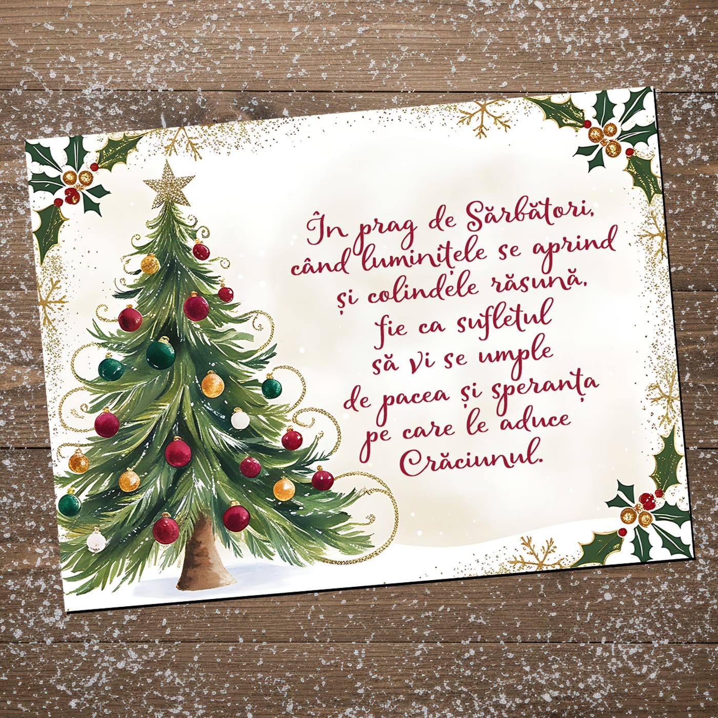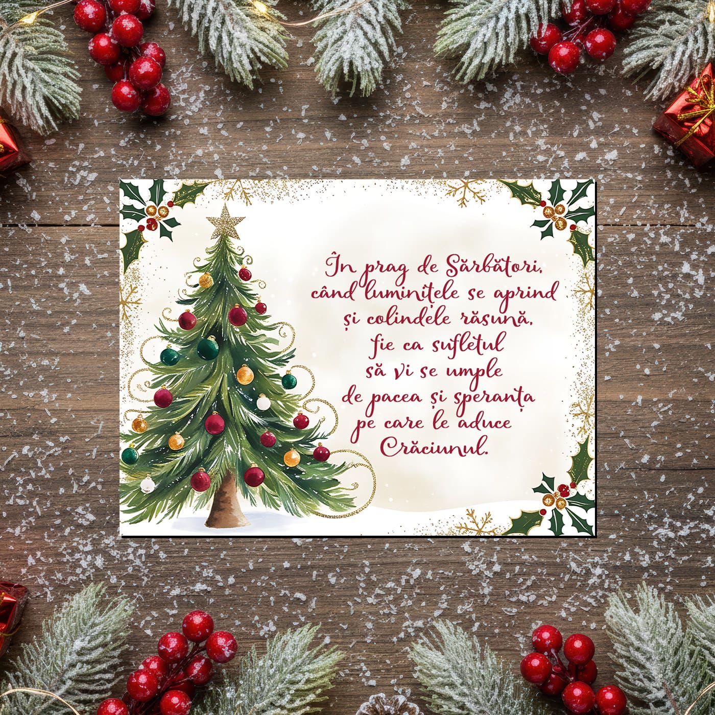 Am pregătit pentru tine un design elegant, cu un brad festiv și un mesaj plin de căldură, care surprinde perfect esența Sărbătorilor: