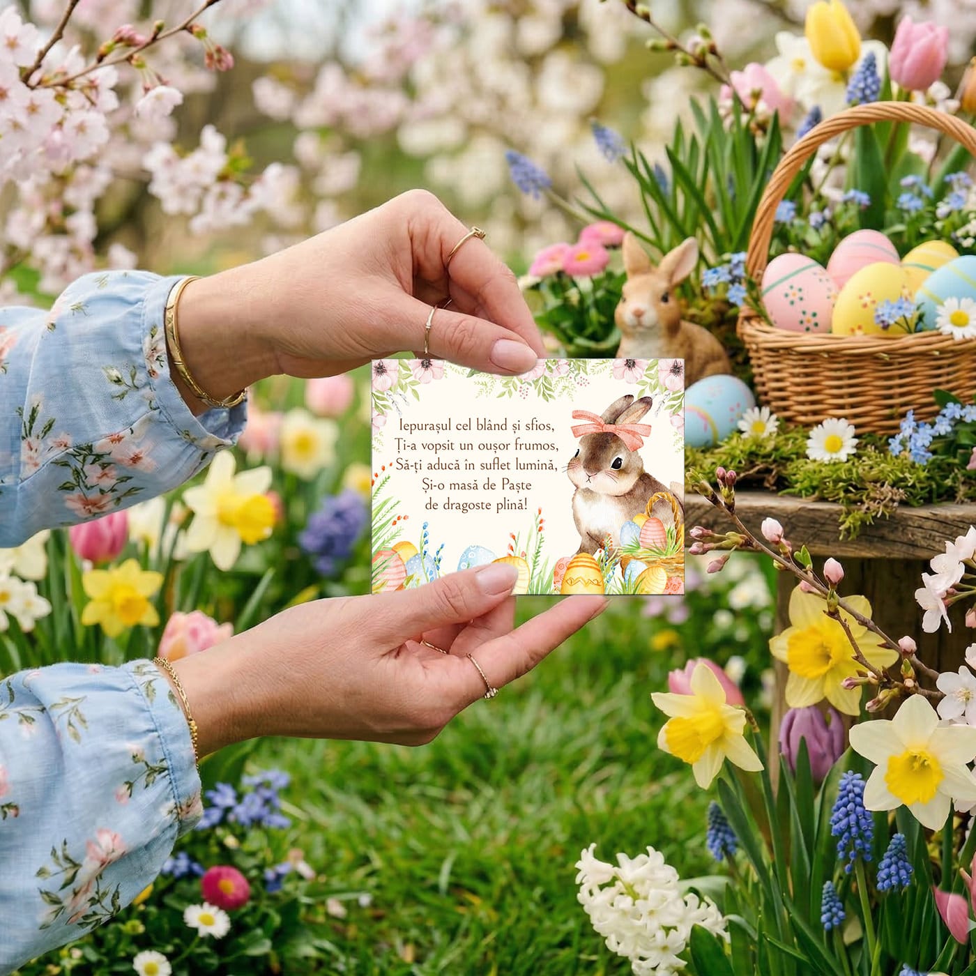- Elemente naturale: Coronița florală cu nuanțe de roz pudrat și verde crud încadrează perfect mesajul, aducând energia proaspătă a sezonului.