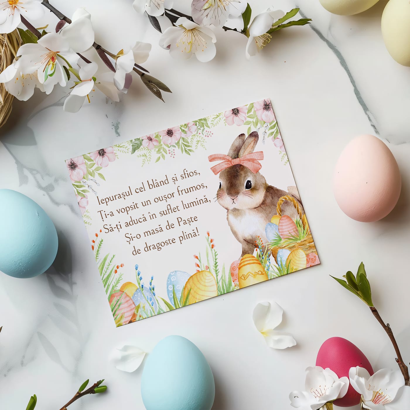 - Ilustrație adorabilă: Un iepuraș pictat în stil acuarelă, cu o fundiță roz delicată și o privire blândă, înconjurat de ouă pastelate.