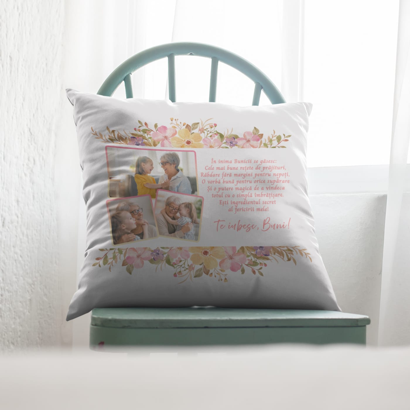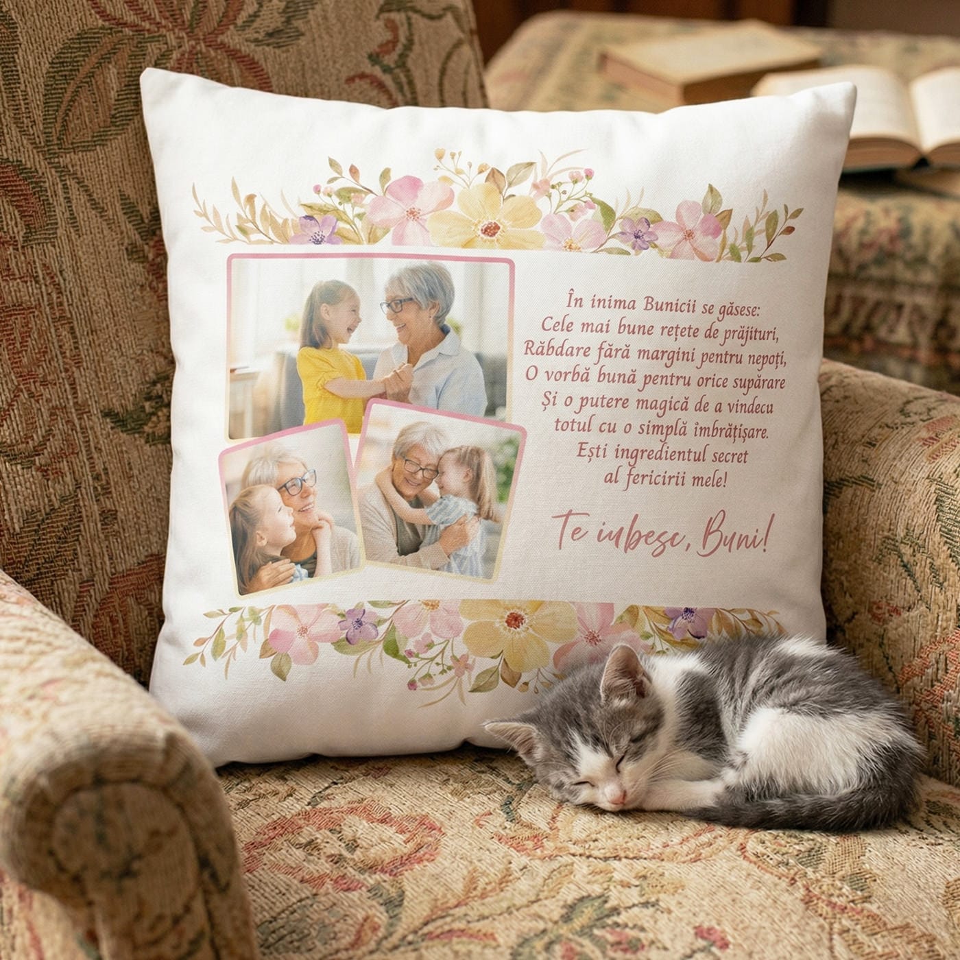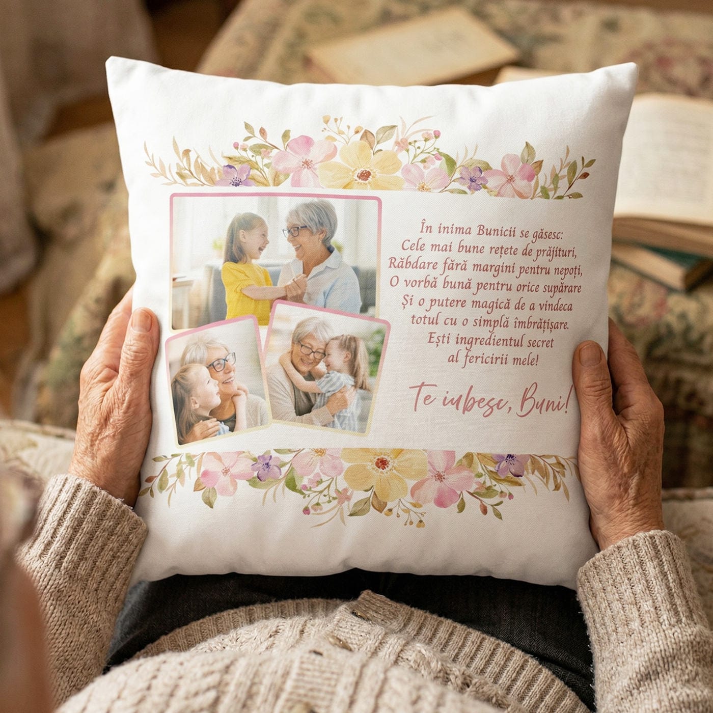 - Semnătură Plină de Iubire: Încheierea „Te iubesc, Buni!” oferă pernei nota finală de afecțiune sinceră.