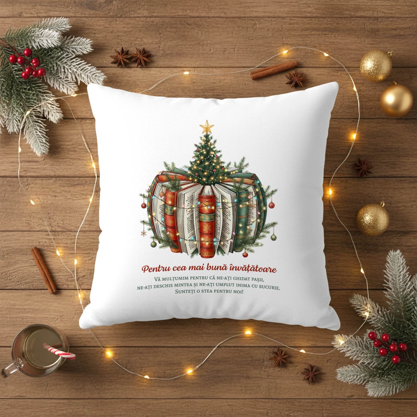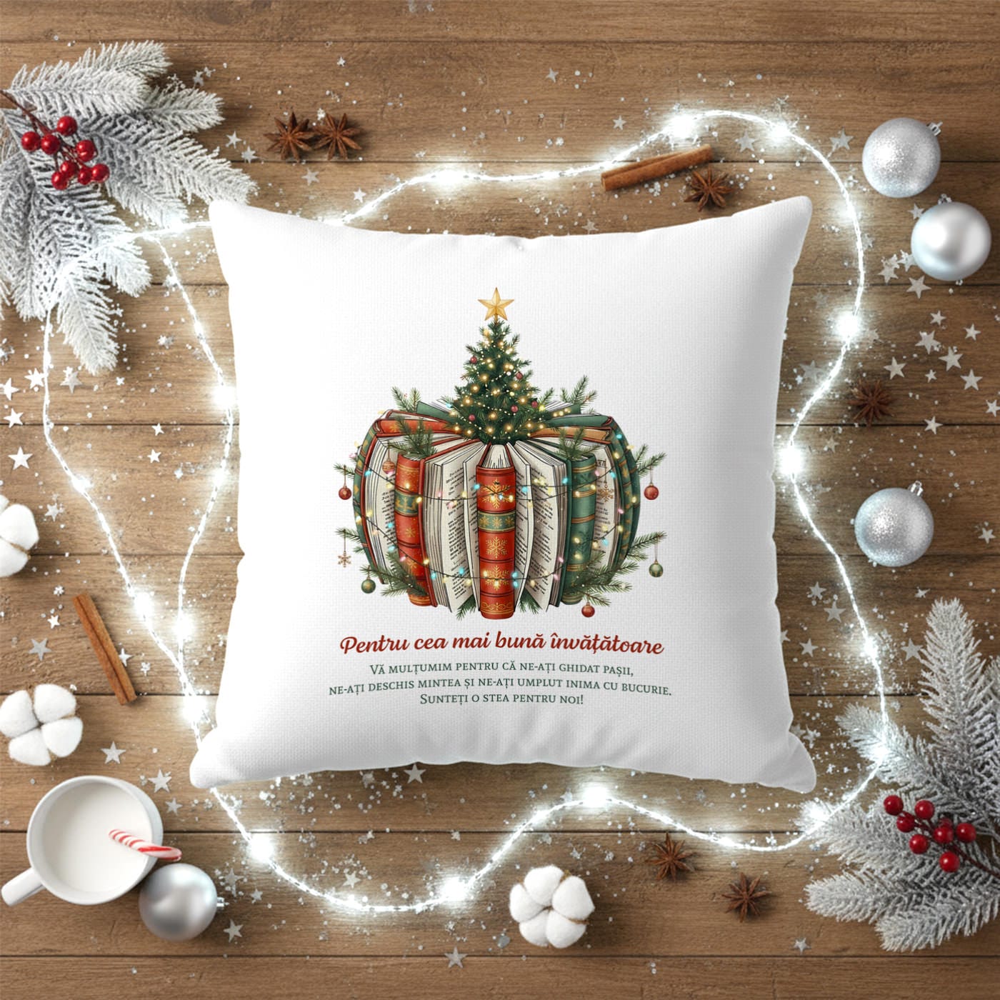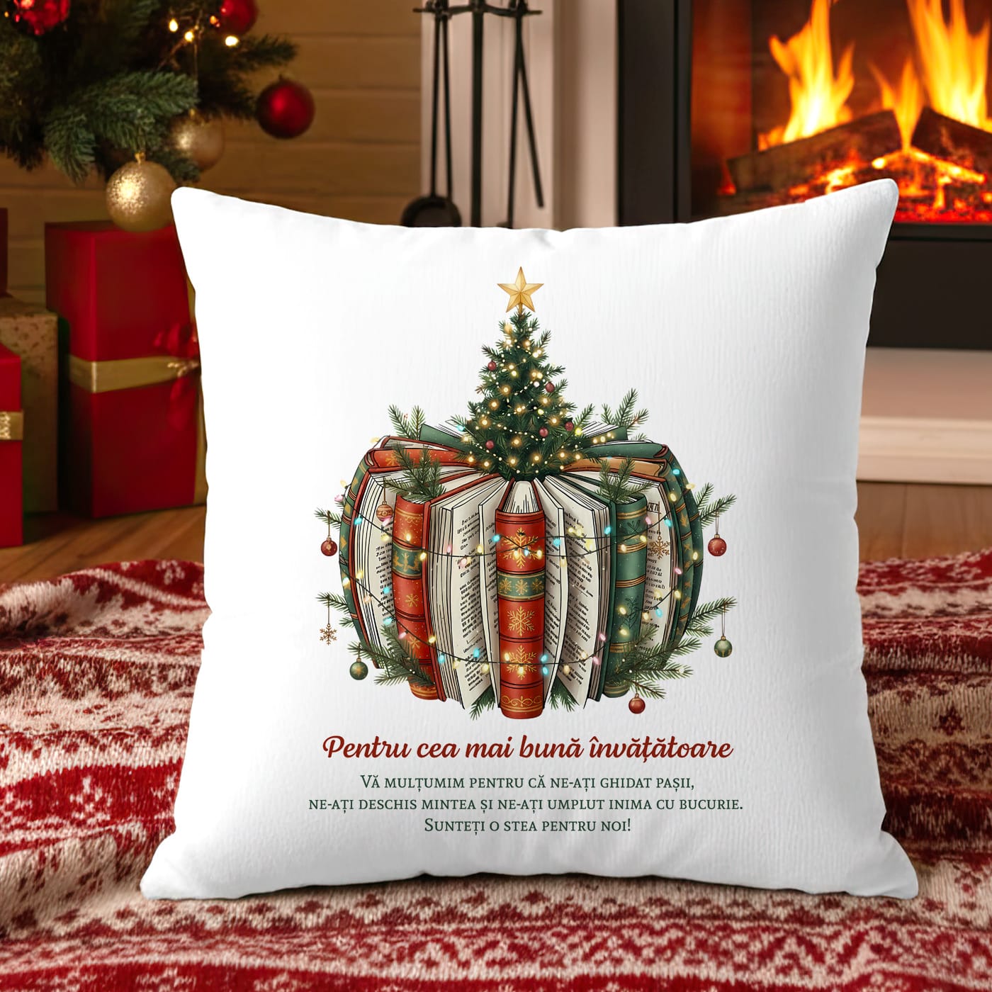 Imaginea centrală este o metaforă superbă: cărțile deschise formează fundația, iar din ele crește un brad de Crăciun luminat. Este imaginea perfectă a educației – o bază solidă din care crește speranța și viitorul. Luminițele delicate adaugă o notă de magie și căldură, transformând perna într-un decor festiv elegant.