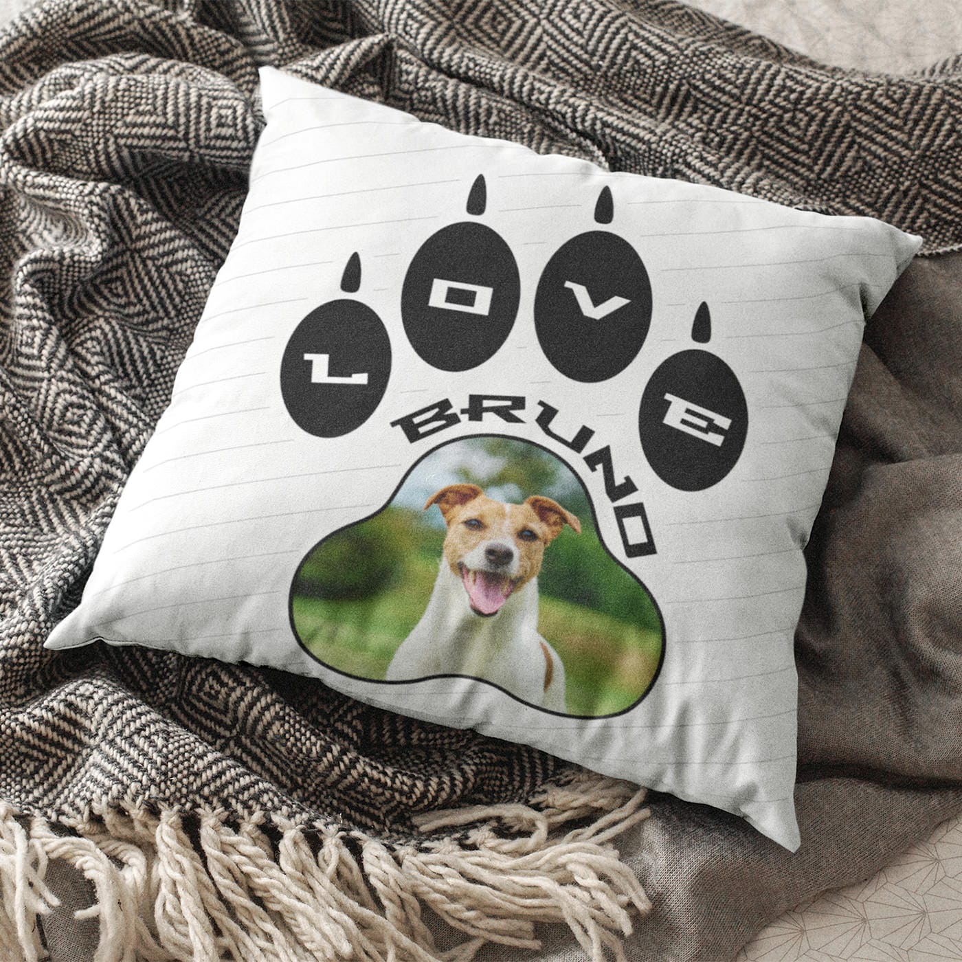 - Numele cu Mândrie: Deasupra fotografiei, urmând curba lăbuței, personalizăm perna cu numele blănosului (ex: BRUNO), scris cu litere negre, moderne și clare.