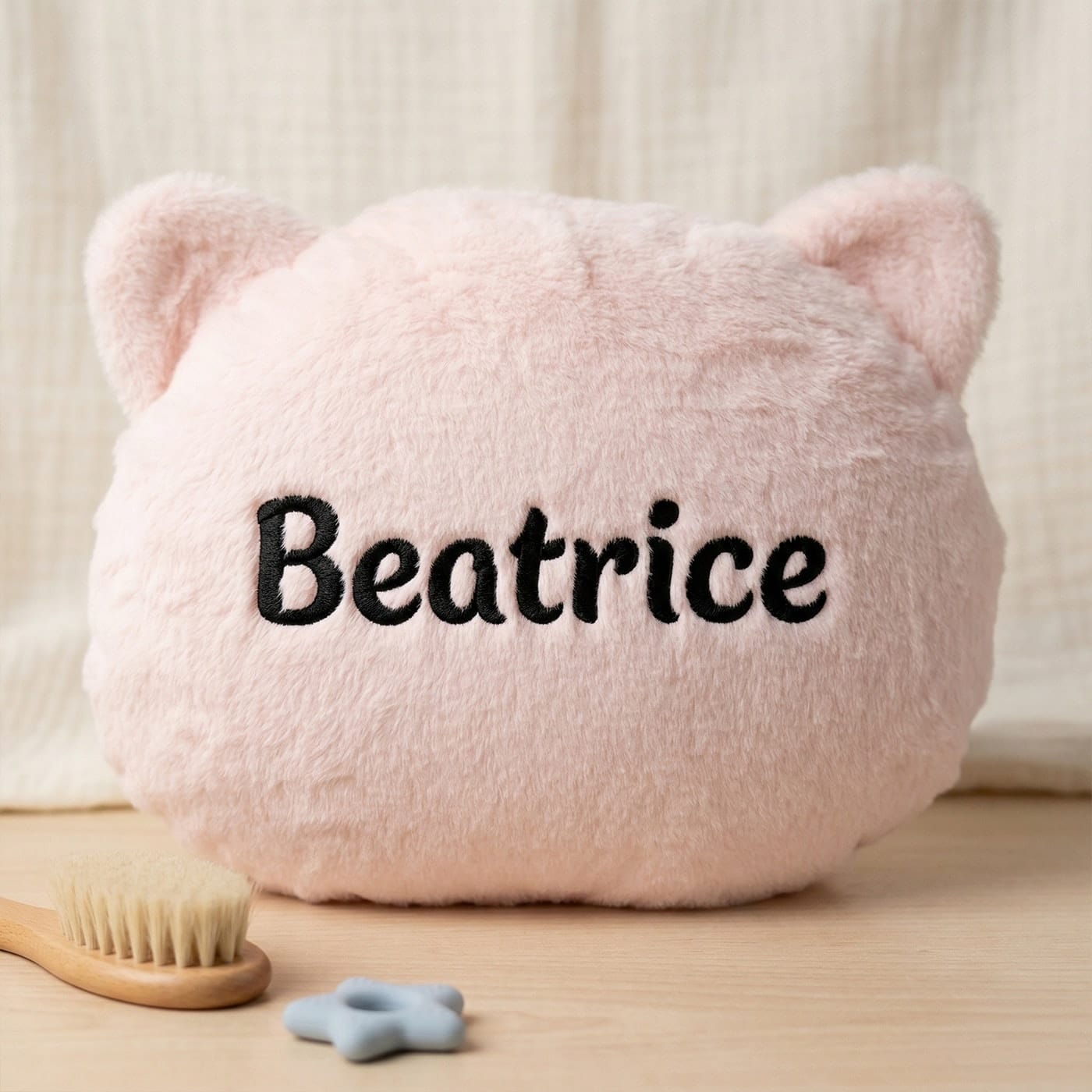 - Personalizare pe Spate: Surpriza vine pe verso! Numele fetiței (ex: Beatrice) este brodat elegant cu ață neagră contrastantă, transformând perna într-un cadou unic și special.