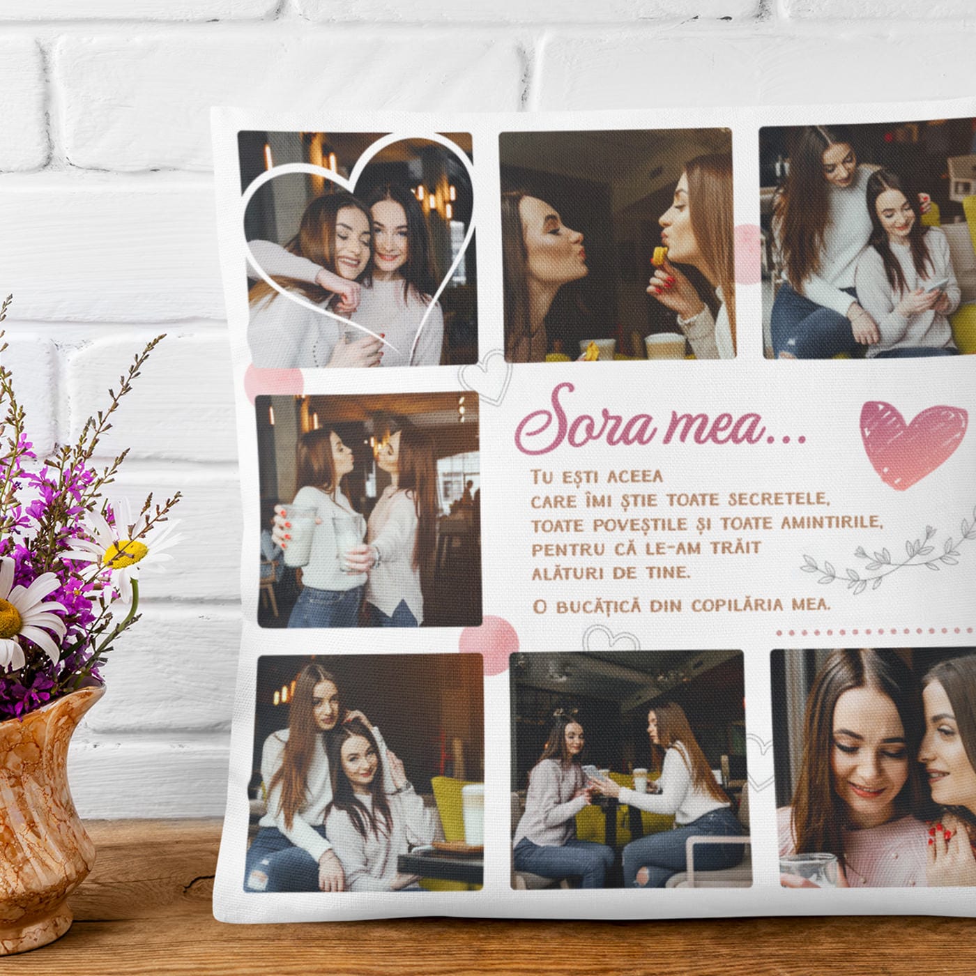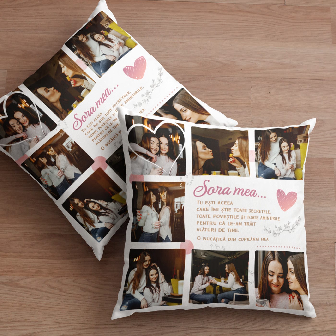Sora ta nu este doar o rudă, este prima ta prietenă și singura persoană care înțelege cu adevărat cum a fost să creșteți împreună. Această pernă personalizată este un tribut adus legăturii voastre indestructibile. Transformă amintirile voastre comune – de la trăsnăile din copilărie până la selfie-urile de azi – într-un cadou de suflet, perfect pentru a fi strâns în brațe.