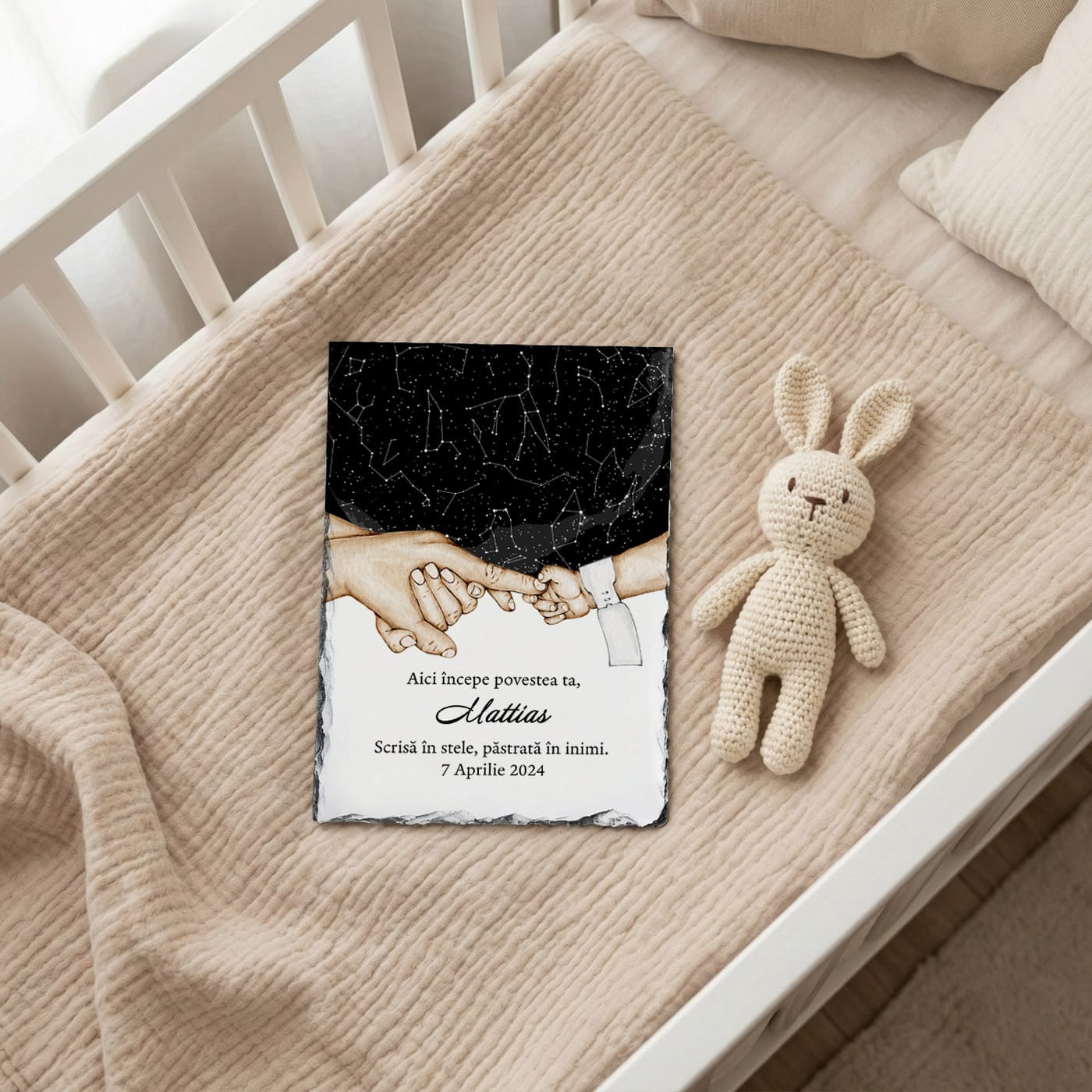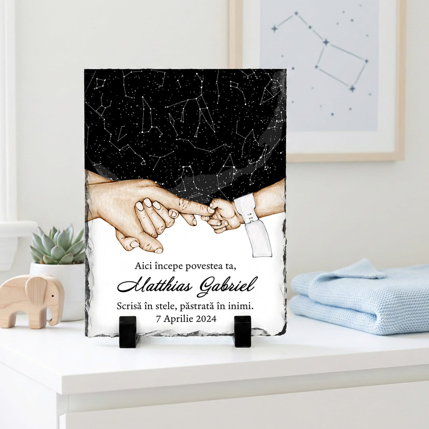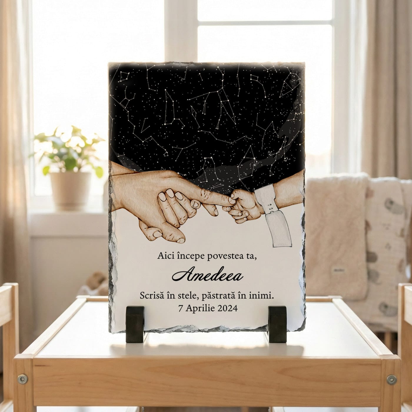 Nașterea unui copil este momentul în care universul se aliniază pentru a crea un miracol. Această placă din ardezie naturală capturează esența acelui moment magic. Este un „certificat de naștere” artistic, care combină simbolistica destinului (stelele) cu cea a protecției părintești (mâinile). Este cadoul ideal pentru a ura „Bun venit pe lume!” într-un mod memorabil.