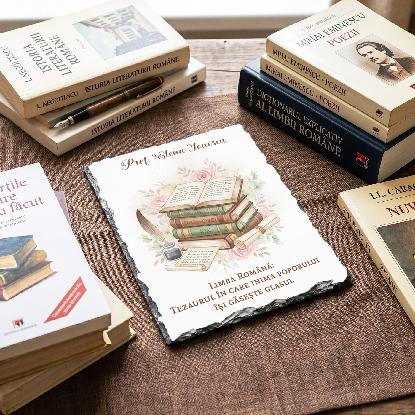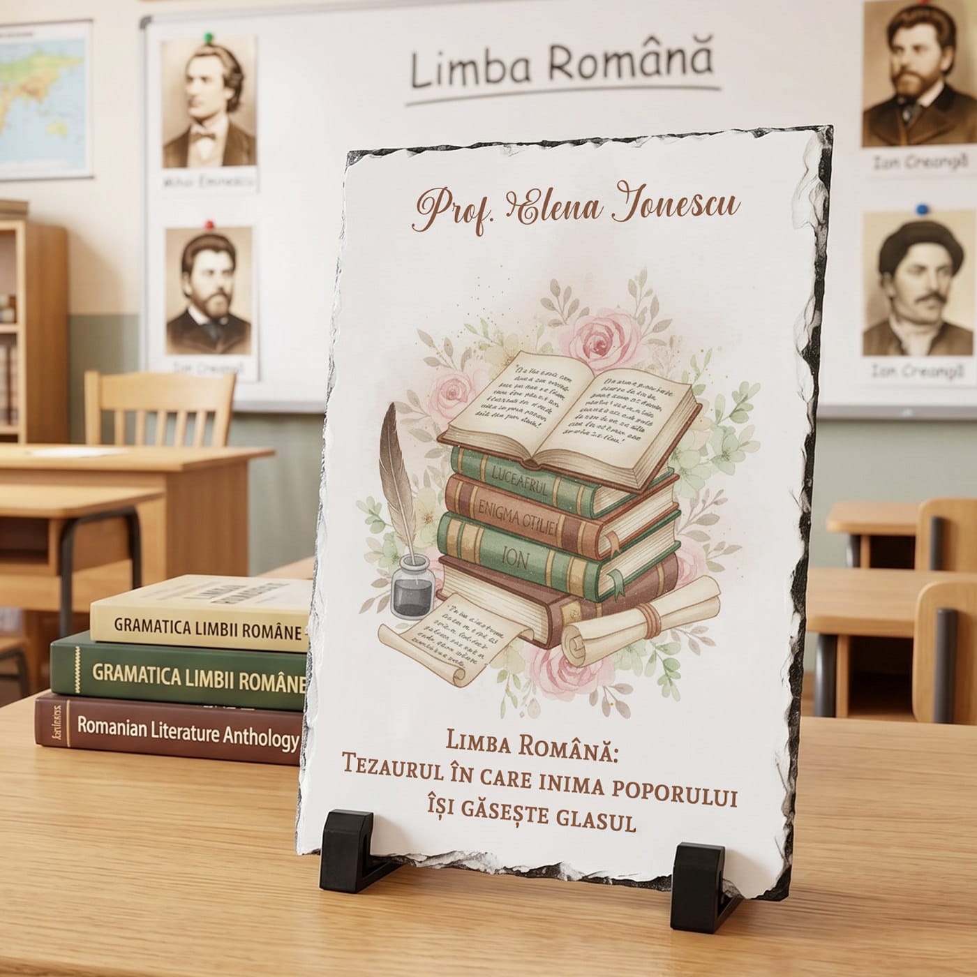 Limba română este fundamentul pe care elevii își construiesc viitorul, iar acest dar simbolic este creat pentru a onora pasiunea și rigoarea cadrului didactic. Placa de ardezie personalizată îmbină eleganța pietrei naturale cu un design tematic rafinat, fiind cadoul ideal pentru a-i mulțumi doamnei profesoare pentru îndrumarea oferită în universul literaturii și al gramaticii.