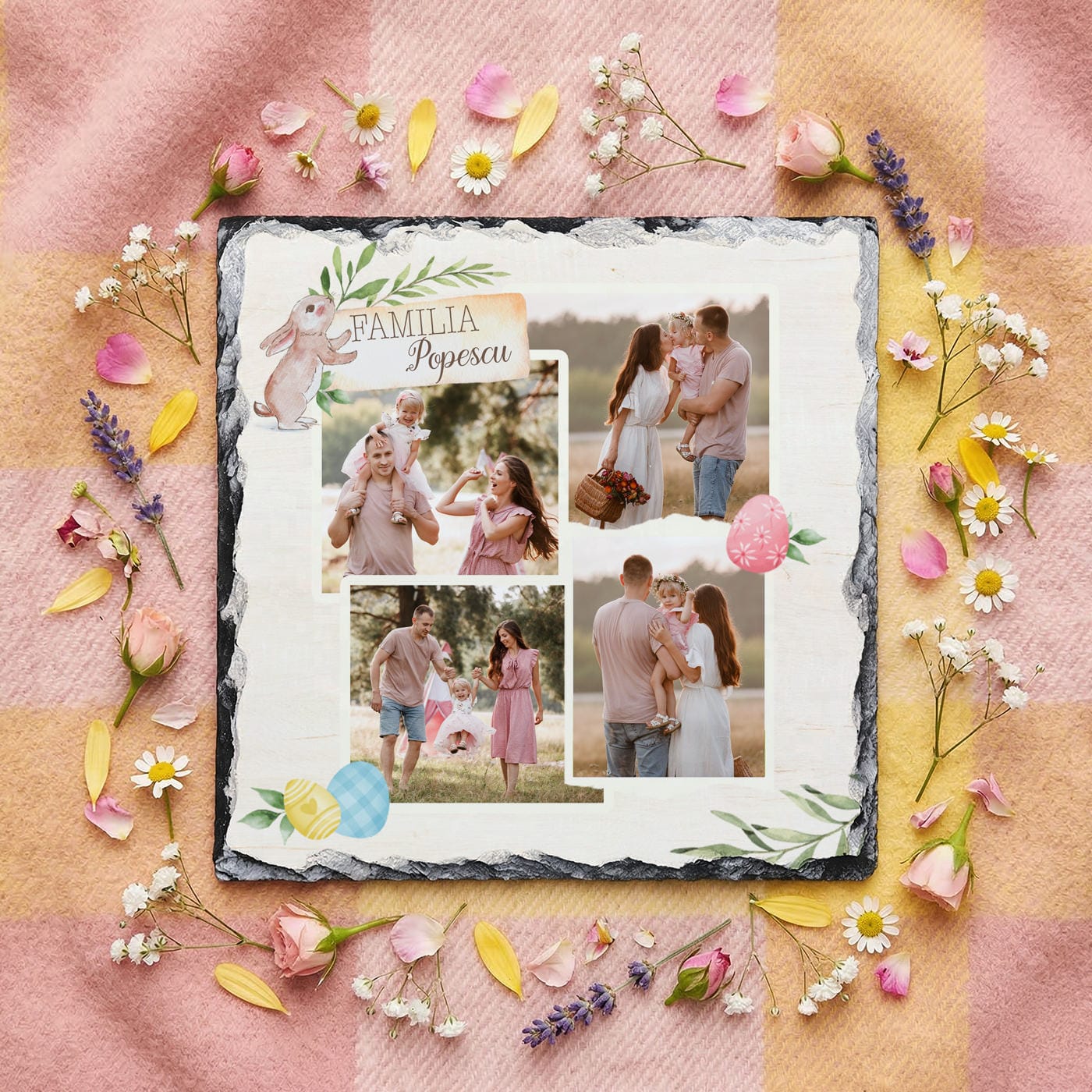 - Patru ferestre către fericire: Formatul tip colaj îți permite să selectezi cele mai dragi patru fotografii de familie – poate de la vânătoarea de ouă de anul trecut sau de la prima plimbare de primăvară.