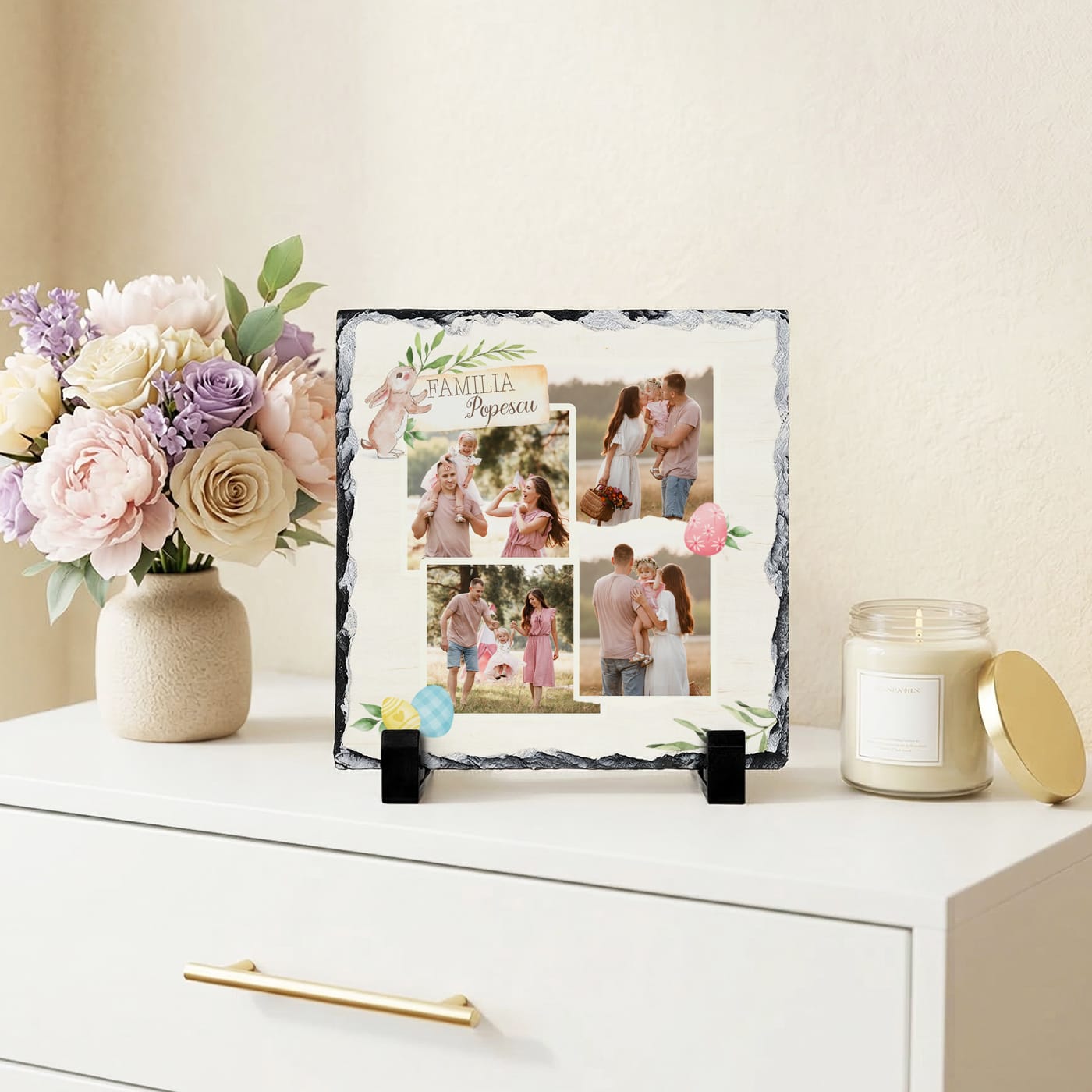 Cauți un cadou care să surprindă esența sărbătorilor de primăvară într-o formă inedită? Această placă din ardezie naturală este o adevărată operă de artă personalizată. Combinând duritatea și eleganța pietrei cu căldura amintirilor voastre, se transformă într-o decorațiune spectaculoasă, menită să atragă toate privirile la masa de Paște și să rămână o amintire prețioasă ani la rând.