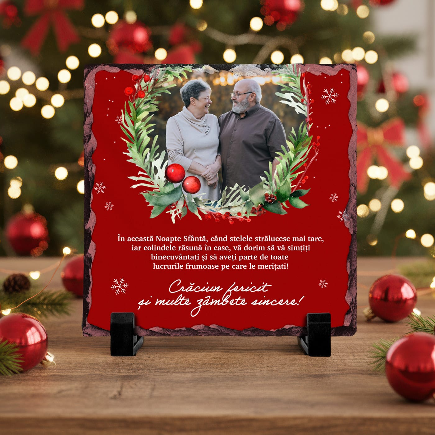 Cele mai frumoase daruri de sărbători nu sunt neapărat cele mai scumpe — sunt cele care transmit un gând sincer. Această placă de ardezie e un astfel de dar: o urare caldă personalizată cu fotografia voastră, concepută să ajungă pe peretele sau etajera cuiva drag și să rămână acolo mult după ce se topește zăpada.