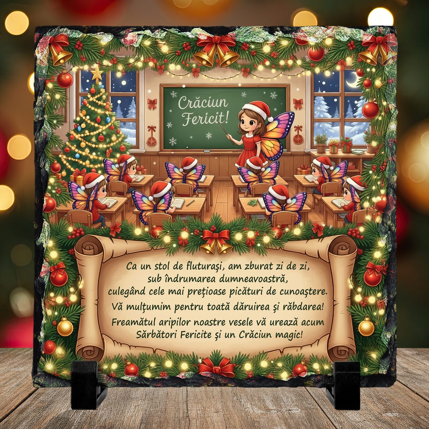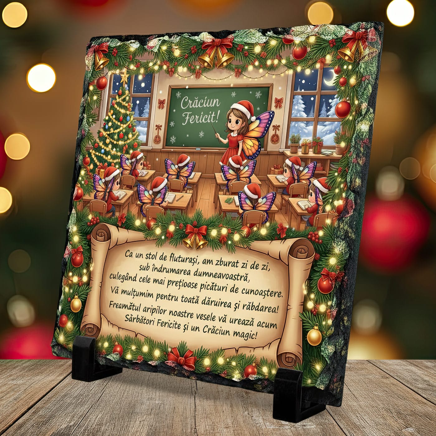 Designul este o capodoperă a fanteziei, o imagine care oglindește perfect realitatea voastră emoțională. Într-o sală de clasă de vis, luminată de magia Crăciunului, o „Zână-Învățătoare” cu aripi delicate le urează „Crăciun Fericit!” micuților ei „elevi-fluturași”. Este o scenă plină de căldură, care celebrează legătura unică pe care o au.