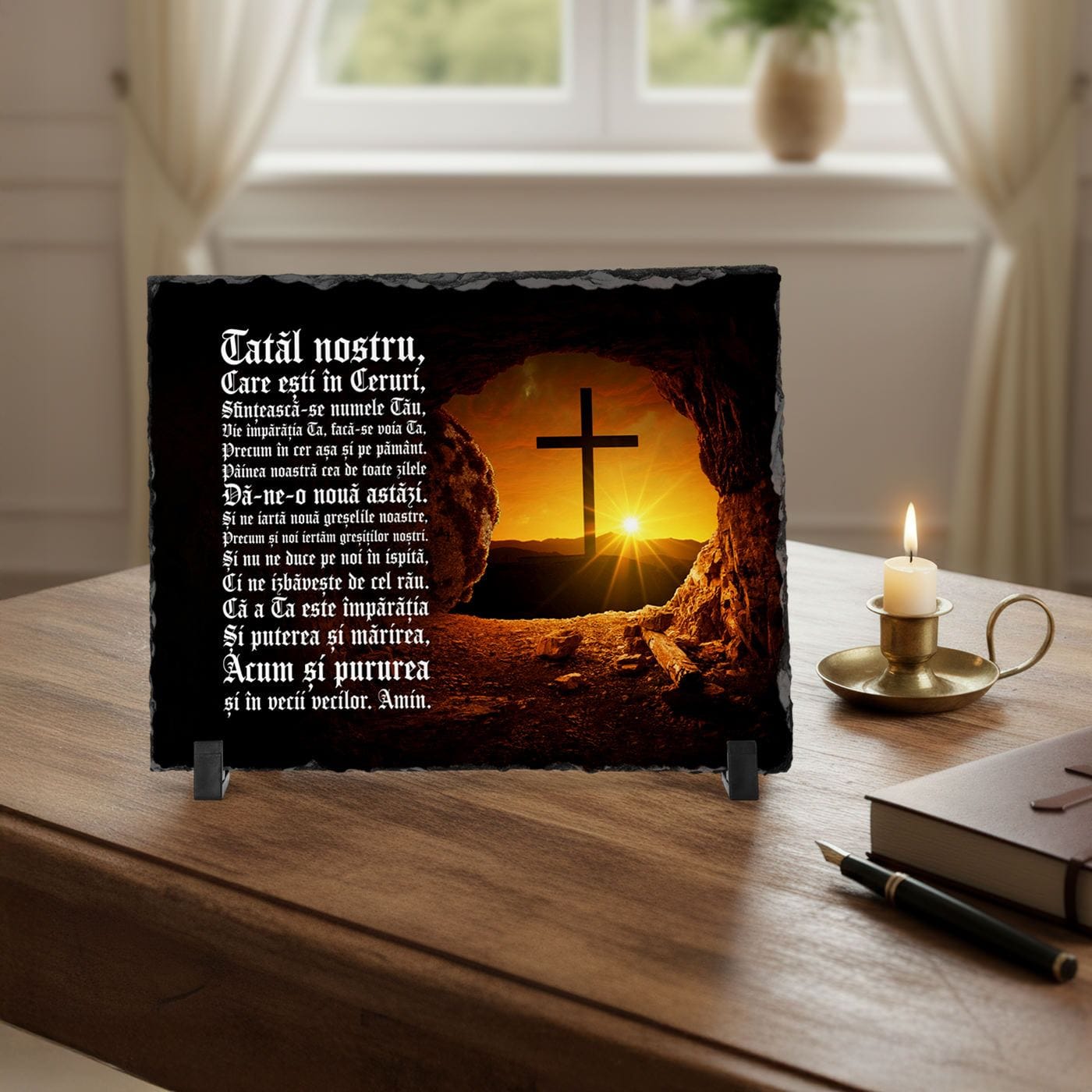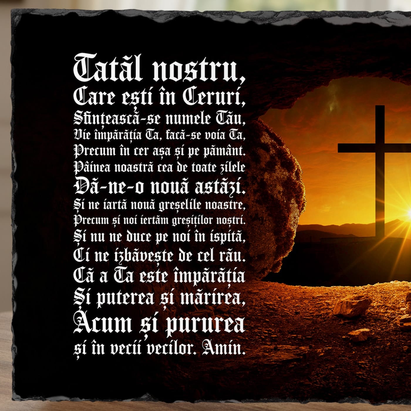 În fiecare casă creștină, simbolurile credinței aduc alinare și un sentiment de protecție. Am creat această placă de ardezie ca pe un obiect de artă sacră modern, menit să aducă în căminul tău frumusețea și puterea celei mai importante rugăciuni.