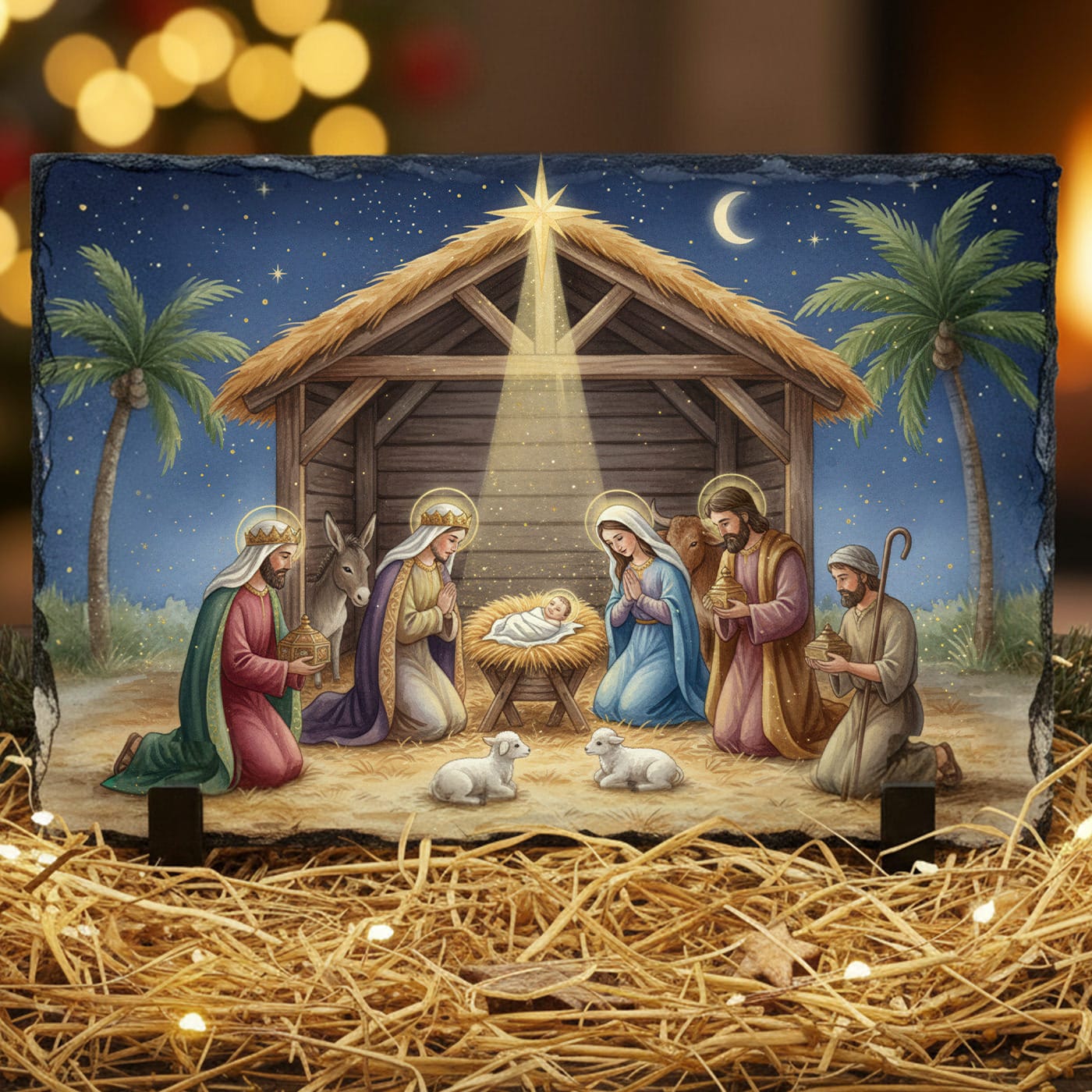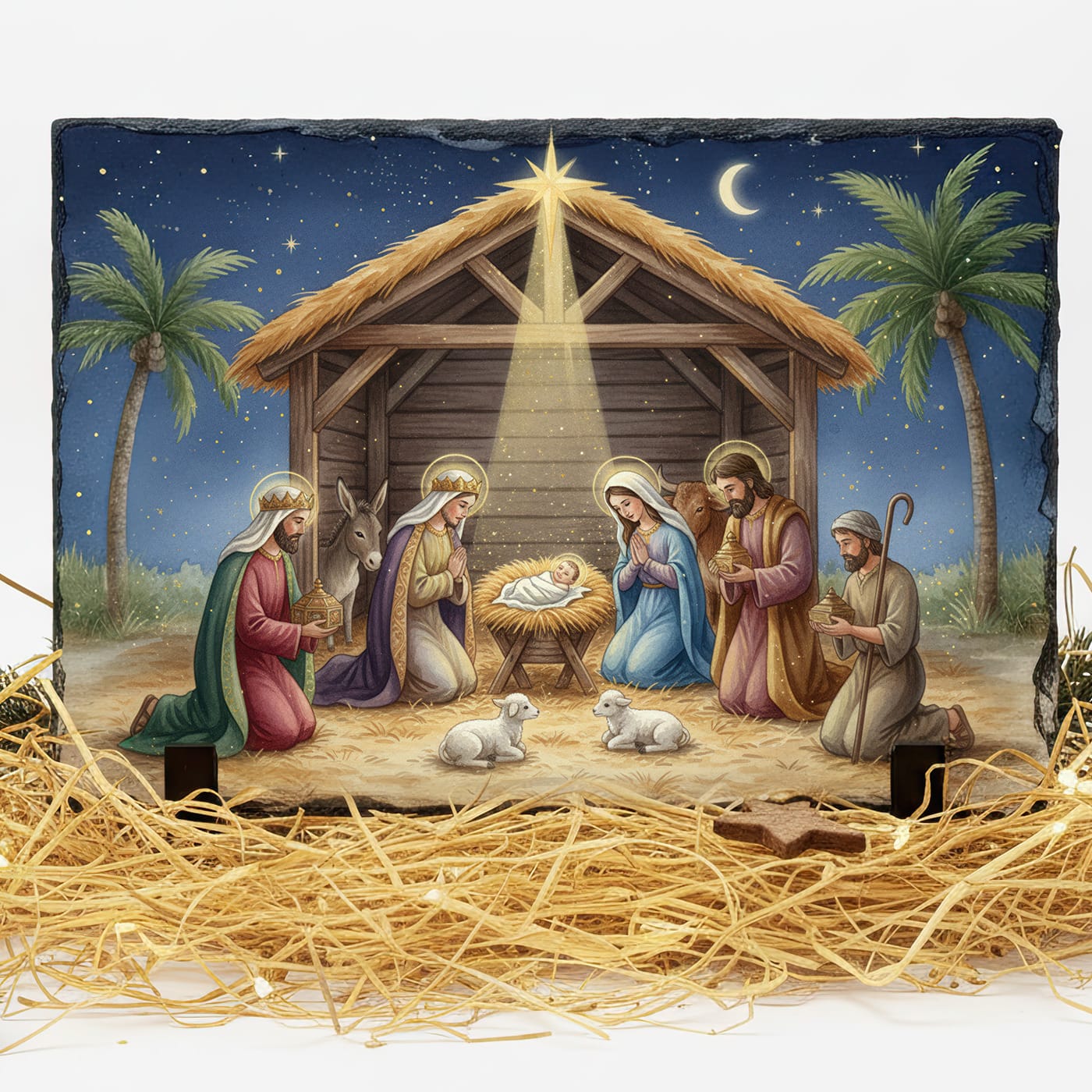 În agitația Sărbătorilor, printre luminițe și cadouri, inima noastră caută mereu să se întoarcă la esență, la motivul real al acestei bucurii: miracolul Nașterii Domnului. Această placă de ardezie nu este o simplă decorațiune. Este o mărturie. Este o fereastră deschisă către Betleem, o piesă de artă sacră care aduce în casa ta pacea, speranța și lumina acelei nopți sfinte.