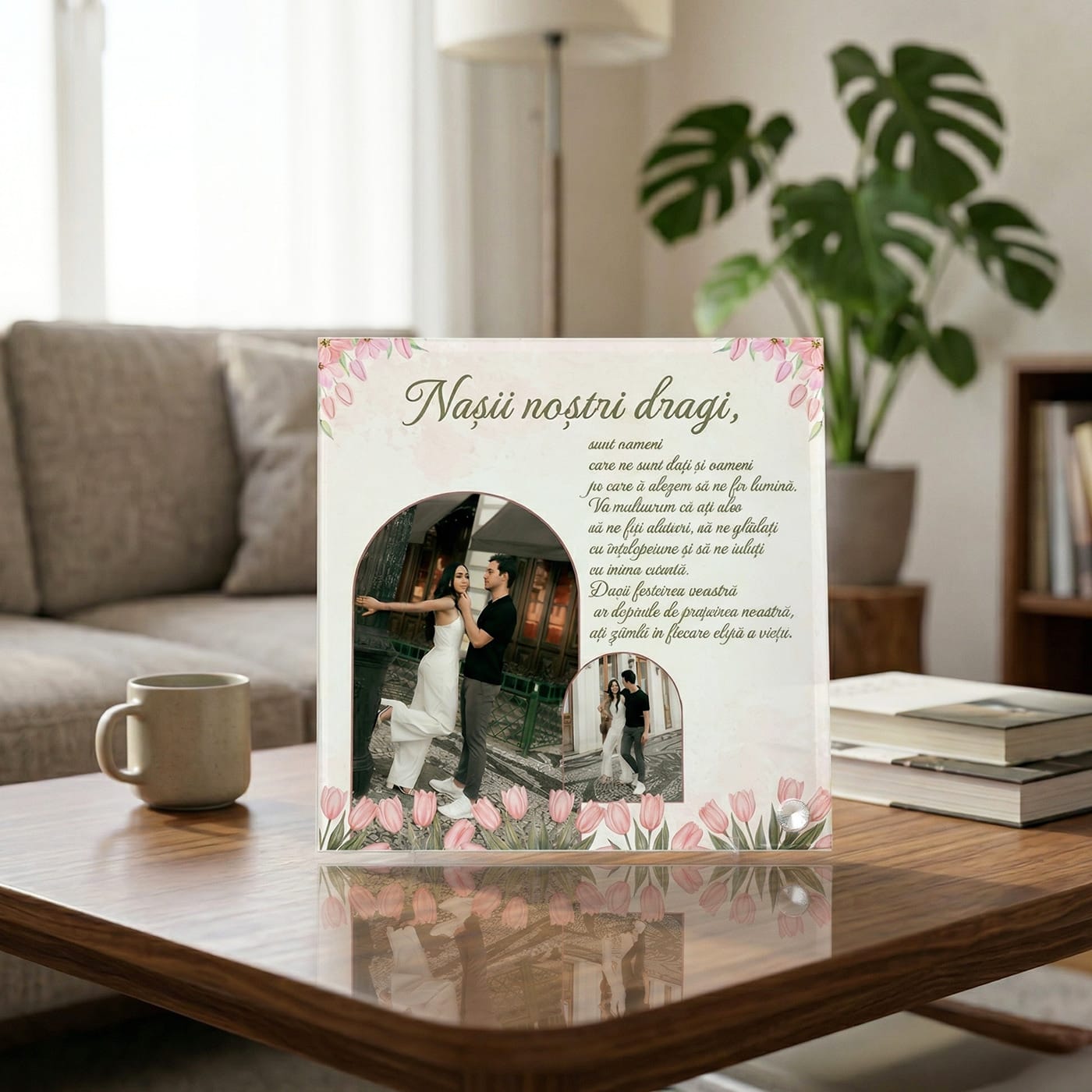 Nașii nu sunt doar martori ai evenimentelor importante, ci devin parte din familia extinsă, oferind sprijin și înțelepciune la fiecare pas. Această placă foto din sticlă premium este mesagerul perfect pentru a le mulțumi că au ales să vă fie alături, transformând recunoștința voastră într-o amintire strălucitoare care va ocupa un loc de cinste în căminul lor.