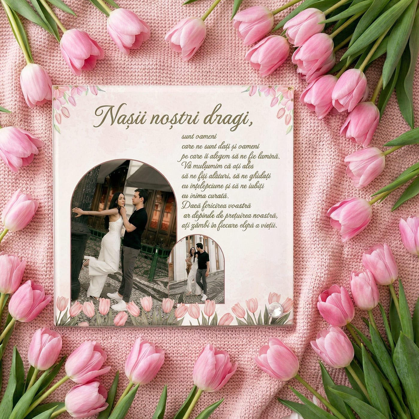 - Grafică cu Lalele Roz: Bordura de lalele delicate, pictate în nuanțe calde de roz, simbolizează afecțiunea pură și un nou început plin de speranță.