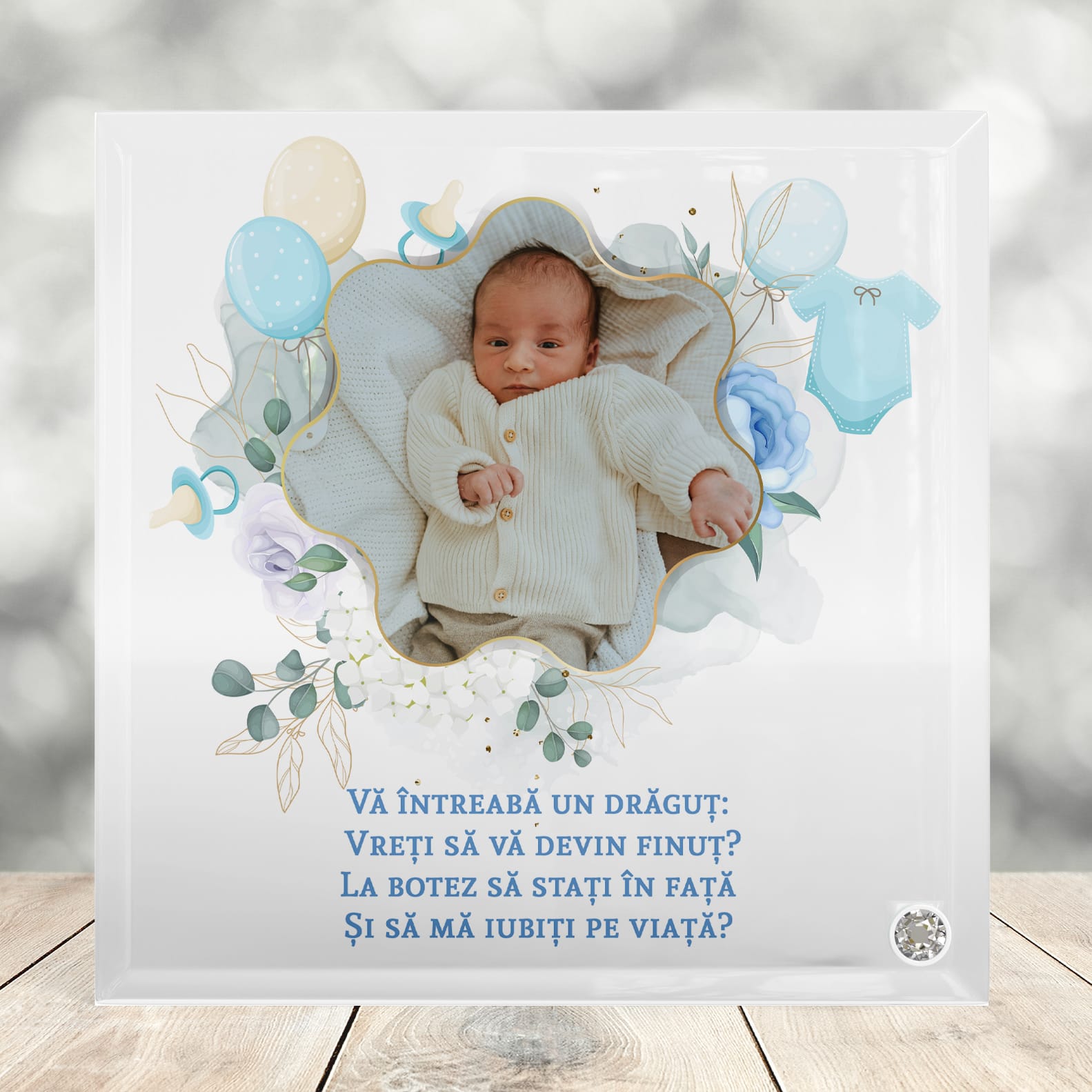 Momentul în care alegeți nașii pentru băiețelul vostru este începutul unei legături de viață. Această placă din sticlă premium transformă invitația voastră într-un dar deosebit, o amintire de cristal care va ocupa un loc de cinste în casa nașilor, amintindu-le mereu de ziua în care au acceptat să fie călăuzele micuțului vostru.