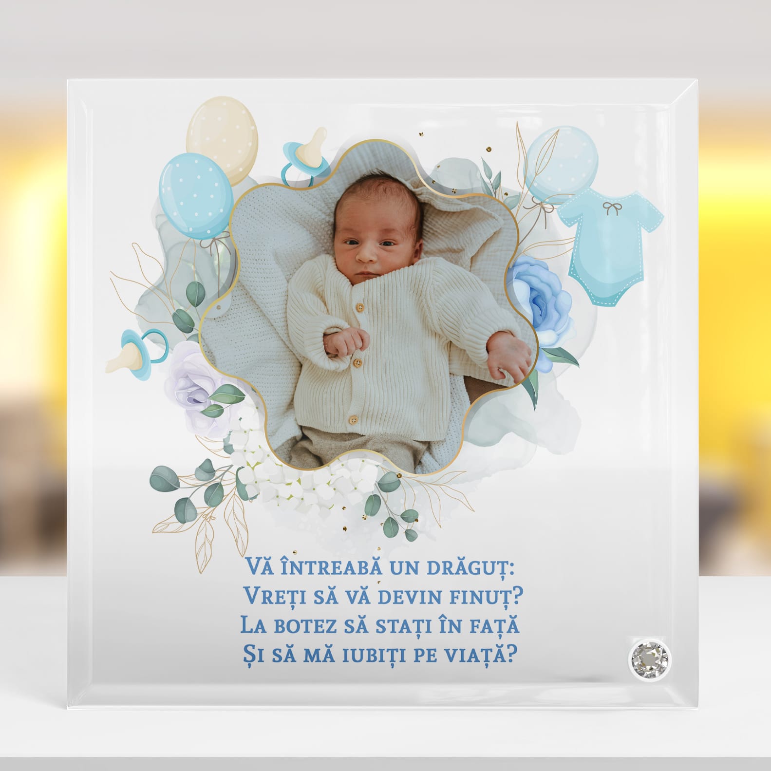 Placa este realizată din sticlă masivă, șlefuită impecabil, oferind o durabilitate și o claritate remarcabile. Tehnologia de imprimare UV asigură culori vibrante care nu își pierd strălucirea în timp, astfel încât mesajul și fotografia micuțului să rămână mărturii vii ale acestui moment special pentru mulți ani de acum înainte.