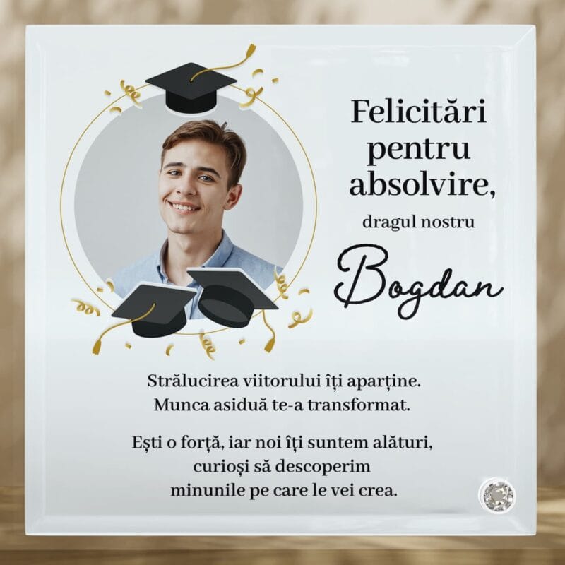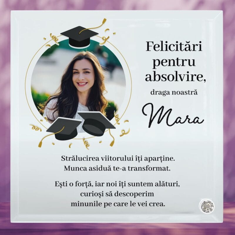 Cauți un cadou de absolvire care să emoționeze și să rămână o amintire prețioasă pentru ani la rând? Placheta noastră de sticlă personalizată este exact ceea ce îți trebuie pentru a celebra acest moment unic – fie că este vorba despre absolvirea gimnaziului, a liceului sau a facultății!