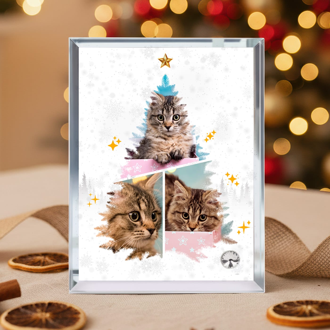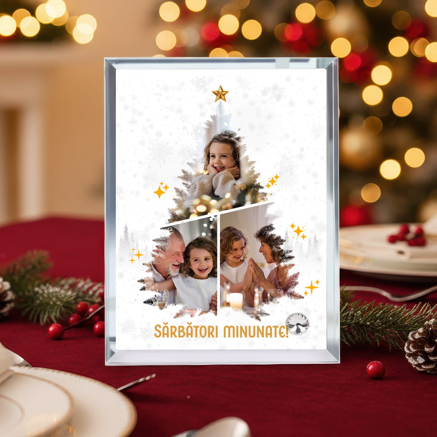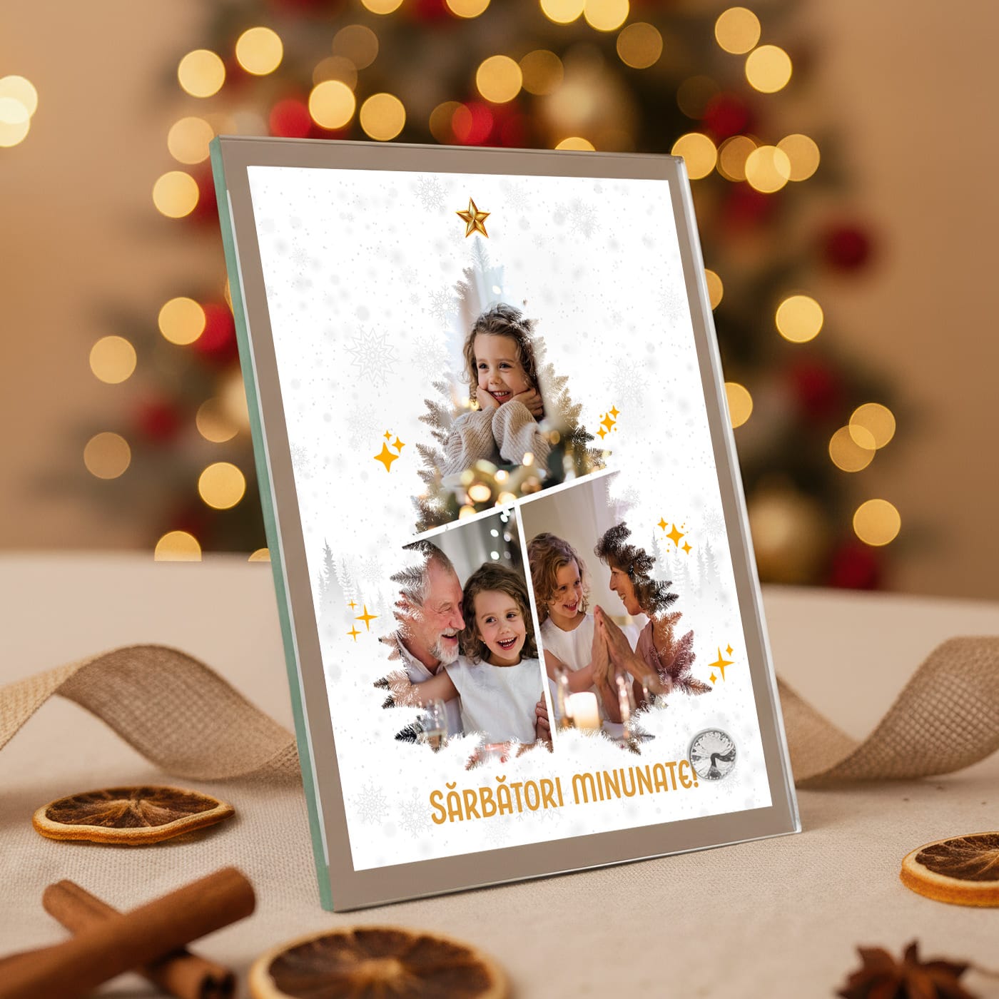 Inima acestui cadou este designul său unic. Cele trei fotografii alese de tine nu sunt pur și simplu așezate, ci sunt integrate artistic pentru a forma silueta unui brăduț de Crăciun, încoronat cu o stea aurie. Este o modalitate creativă și plină de farmec de a expune portrete de familie, zâmbete de copii sau chiar cele mai drăgălașe poze cu animalul de companie în spiritul sărbătorilor.
