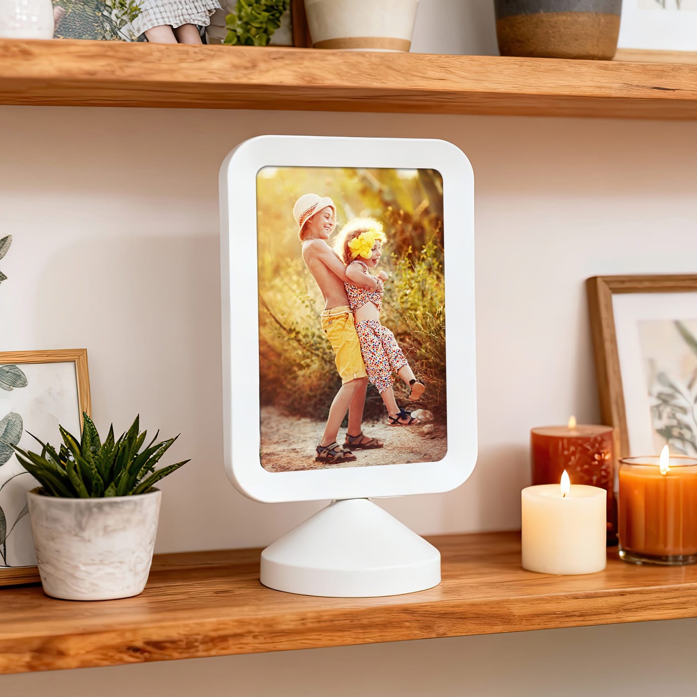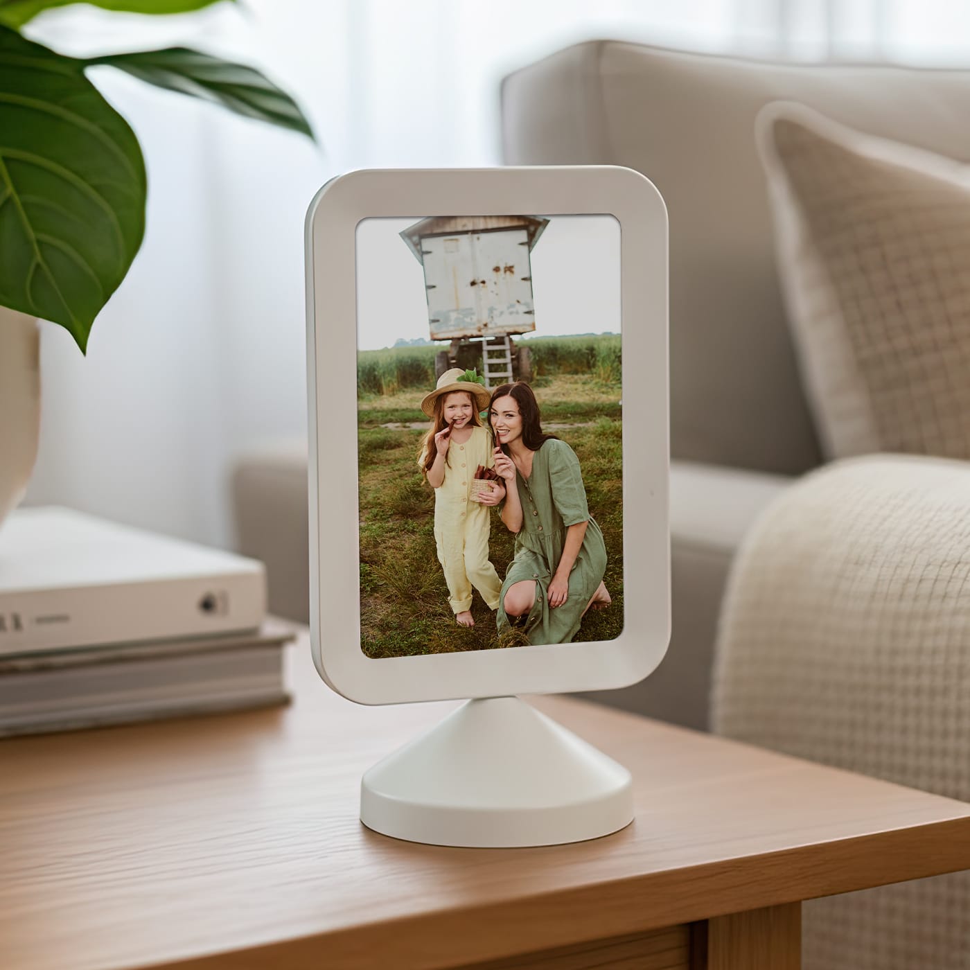 Cu un design minimalist și modern, această ramă se potrivește perfect în orice decor. Baza conică îi oferă o stabilitate perfectă, permițându-i să fie așezată cu eleganță pe birou, pe noptieră sau pe raftul din camera copilului. Și pentru a se potrivi perfect stilului tău, o poți alege în două culori delicate: alb pur sau roz visător.