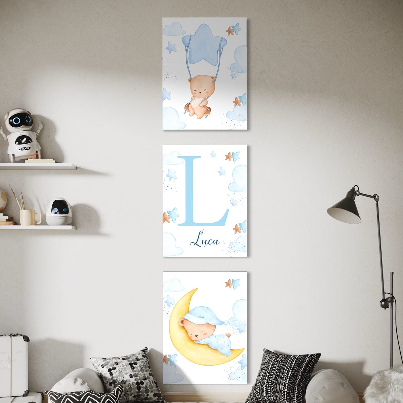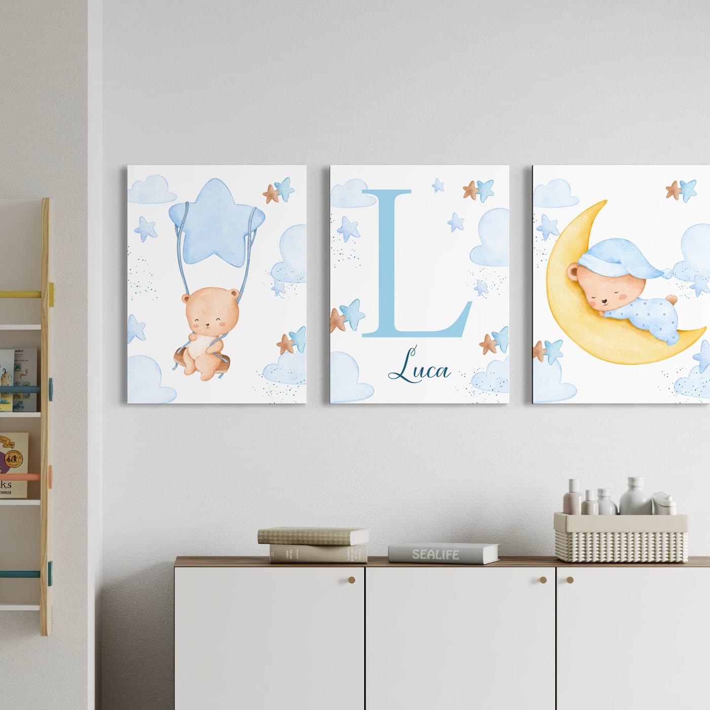 Știi acel sentiment când intri într-o cameră de bebeluș și totul pare magic? Acel sentiment îl poți crea chiar tu. Acest set de trei tablouri personalizate nu este doar o decorațiune, ci este promisiunea unui spațiu plin de iubire, calm și visare. Este piesa de rezistență care leagă întregul design al camerei, creat special pentru băiețelul sau fetița ta.
