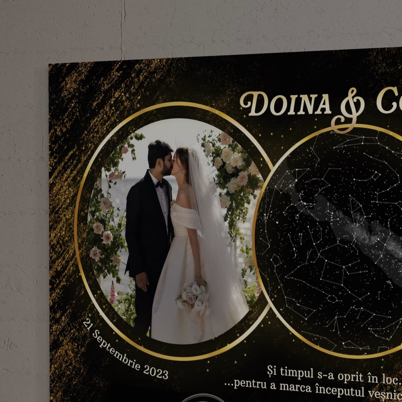 Există momente atât de intense încât pare că timpul se oprește și universul își ține respirația. Ziua nunții voastre este unul dintre ele. Acest tablou canvas premium unește două lumi: cea a amintirilor tangibile (fotografia voastră) și cea a destinului cosmic (harta stelelor). Este o piesă de artă luxoasă care spune: „Așa arăta fericirea noastră, și așa ne-au privit stelele.”