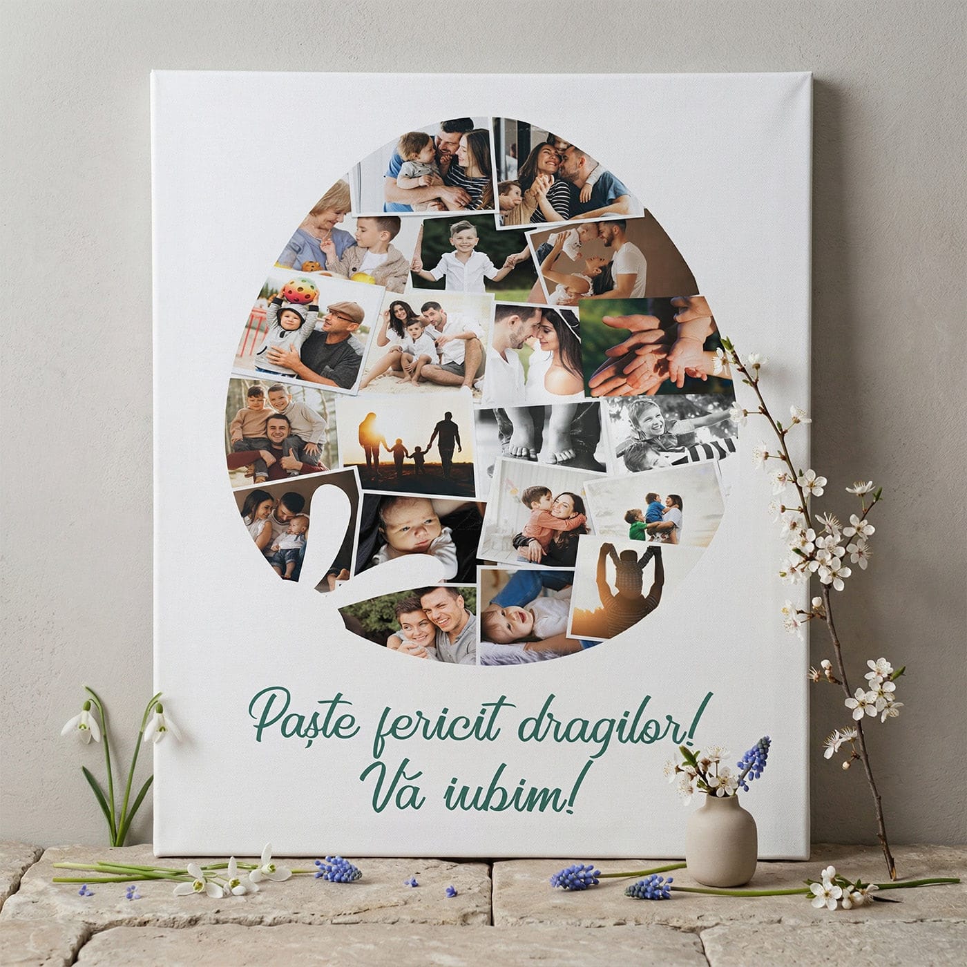 Creează un decor de Paște cu adevărat unic și personal. Acest tablou canvas adună cele mai frumoase fotografii ale tale și le aranjează într-un colaj creativ, în formă de ou de Paște. Este o piesă de artă personală, care aduce căldura amintirilor de familie în centrul sărbătorii.
