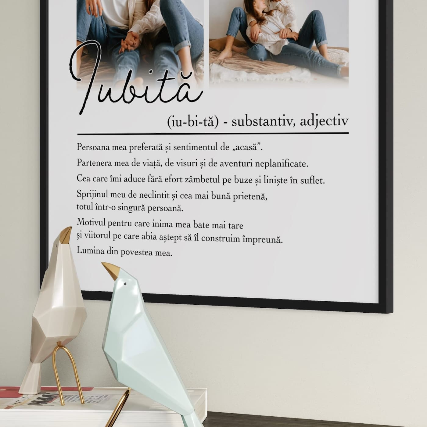 Uneori, cuvântul „iubită” este prea simplu pentru a cuprinde tot ceea ce înseamnă ea pentru tine. Ea este parteneră de viață, cea mai bună prietenă, sprijin de neclintit și sentimentul de „acasă”, totul într-o singură persoană. Acest tablou a fost creat pentru a oferi o definiție personală, venită direct din inima ta. Nu este un simplu cadou, ci o declarație de iubire, o scrisoare deschisă care îi arată, în cuvinte și imagini, locul unic pe care îl ocupă în povestea ta.