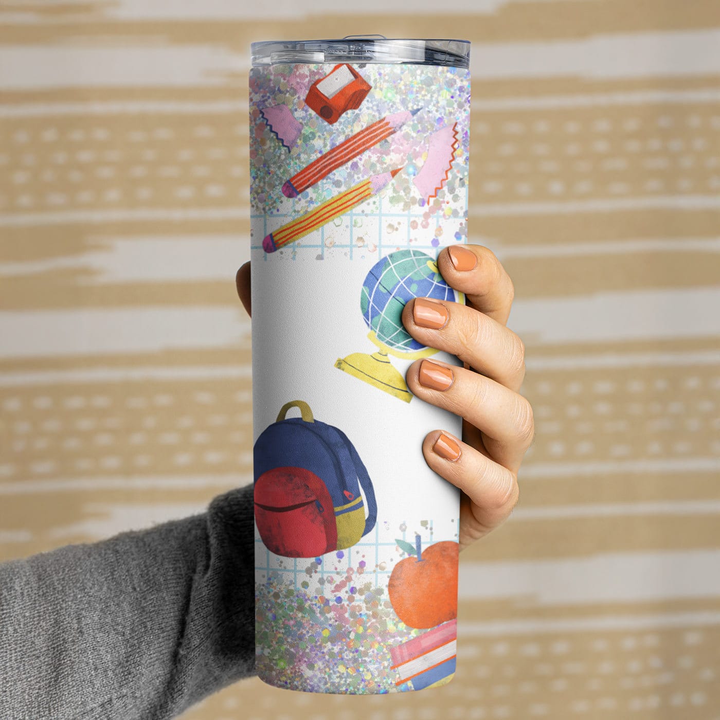 Designul este o explozie de bucurie, inspirat de universul creativ al grădiniței. Ilustrații simpatice cu autobuzul școlar, creioane colorate, un glob pământesc și un ghiozdan sunt așezate pe un fundal cu sclipici imprimat, creând un aspect vibrant și plin de energie.