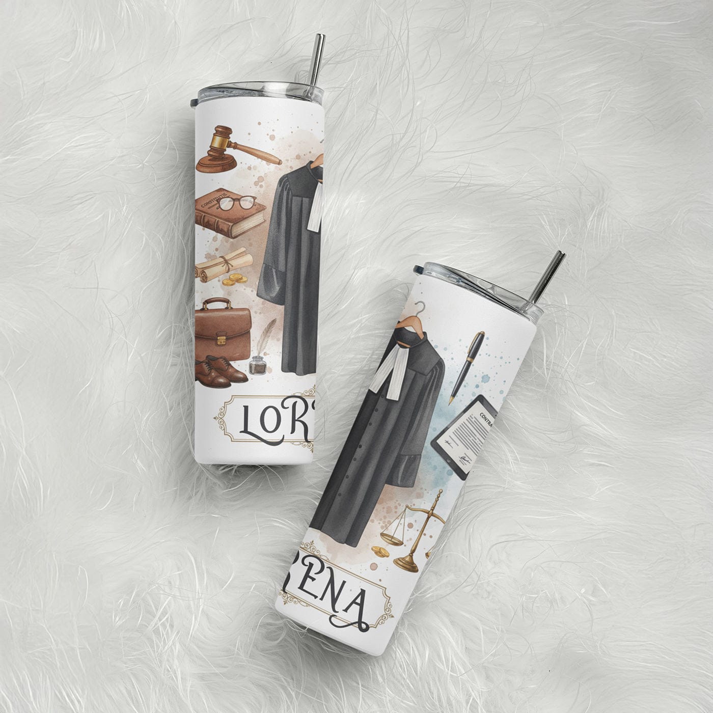 Pentru a transforma acest obiect într-un cadou cu adevărat personal, adăugăm numele avocatului, judecătorului sau studentului la drept (ex: „Lorena”), integrat armonios în design. Pe lângă estetică, funcționalitatea este esențială. Realizat din oțel inoxidabil cu perete dublu, acest termos de 600ml este proiectat să mențină băuturile calde sau reci pentru ore în șir. Capacul etanș și paiul reutilizabil îl fac partenerul ideal pentru un stil de viață activ.