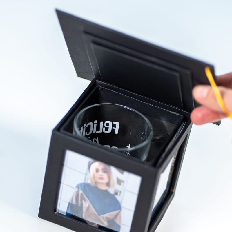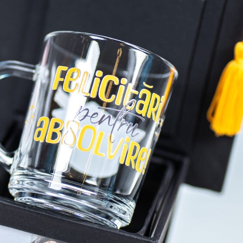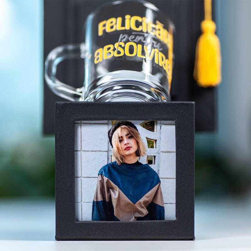 Pentru ca bucuria să fie completă, setul include o cană fină din sticlă transparentă, cu mâner, elegantă și practică. Este gata să-i fie alături la cafeaua ce inspiră noi proiecte mărețe dimineața sau la ceaiul cald și relaxant ce aduce liniște după o zi plină. Este un cadou-pereche ce îmbină perfect emoția prețioasă a amintirilor (toca foto personalizată) cu promisiunea dulce a viitorului (cana pentru noi începuturi și momente de răsfăț).